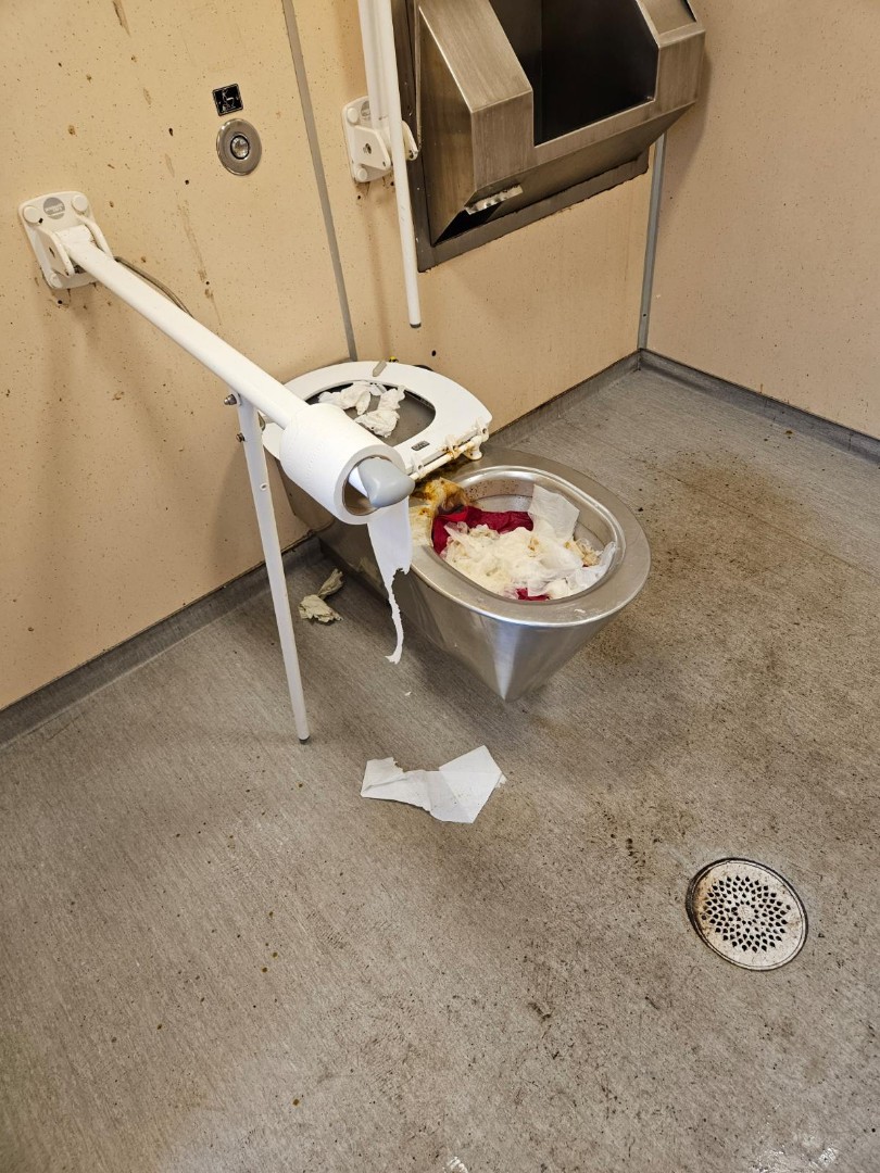 – Slik tilgrising av toalettene er det vi minst ønsker. Gi beskjed til nærmeste vegtrafikksentral på 175 om du finner det slik, sier Jørn Simonsen i Statens vegvesen. Foto: Statens vegvesen