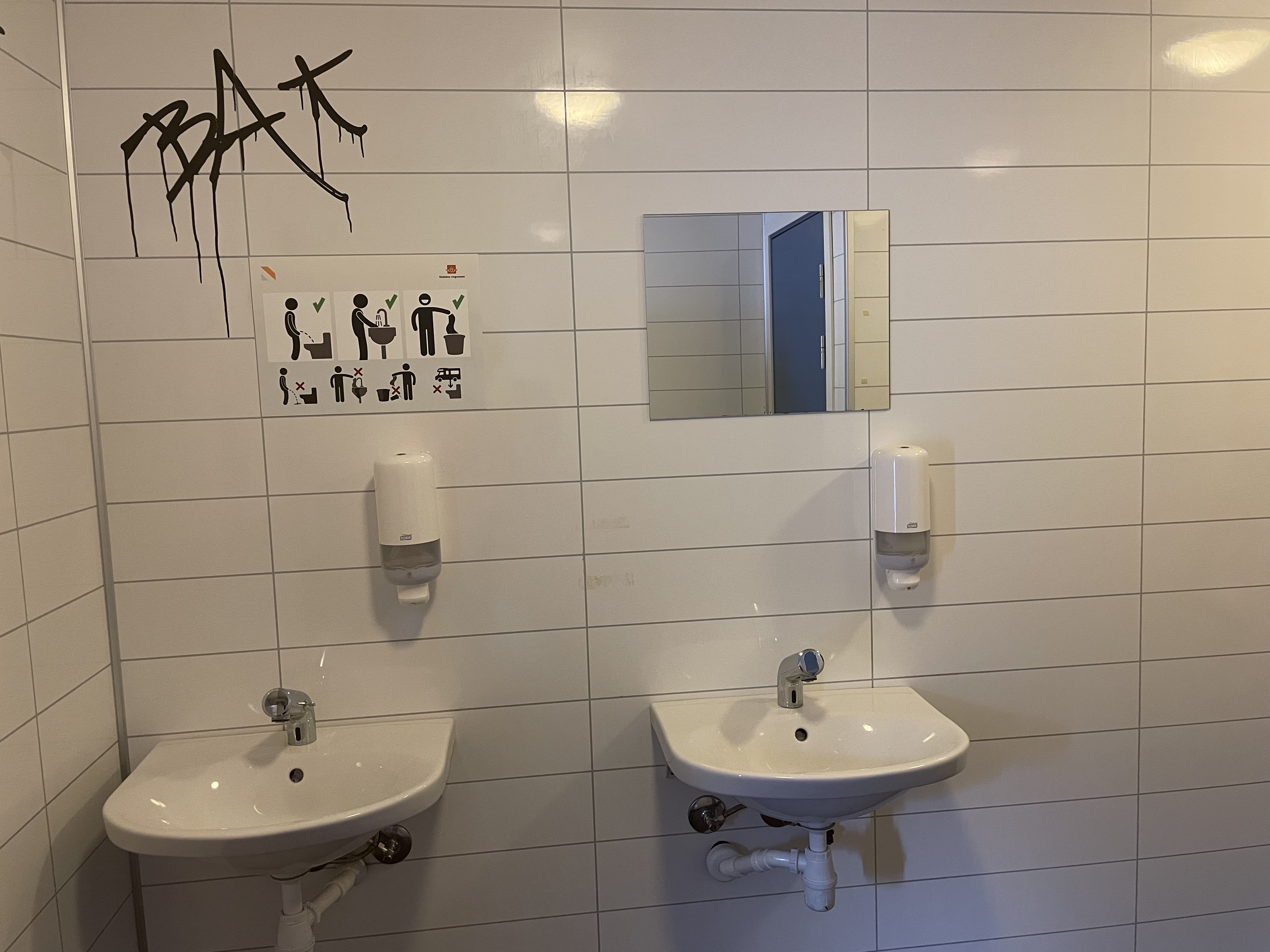 Her er det tagget på veggen inne på et toalett. Dette er unødvendig. Foto: Lars Olve Hesjedal, Statens vegvesen