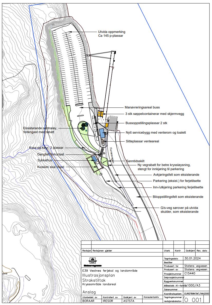– Strakstiltaka skal mellom anna auke trafikksikkerheita for mjuke trafikantar ved å styre trafikken til og frå parkeringsarealet, redusere lengda på dagens fotgjengarkryssing og legge til rette for av- og påstigning til buss like inntil ferjekaia. Den gamle ‘’Furneskiosken’’ blir riven og det skal settast opp eit heilt nytt servicebygg nærare kaia. Det skal også etablerast løysing for sykkelparkering, og renovasjonsløysinga skal vidareførast, seier byggeleiar Kristian Hauståker i Statens vegvesen.