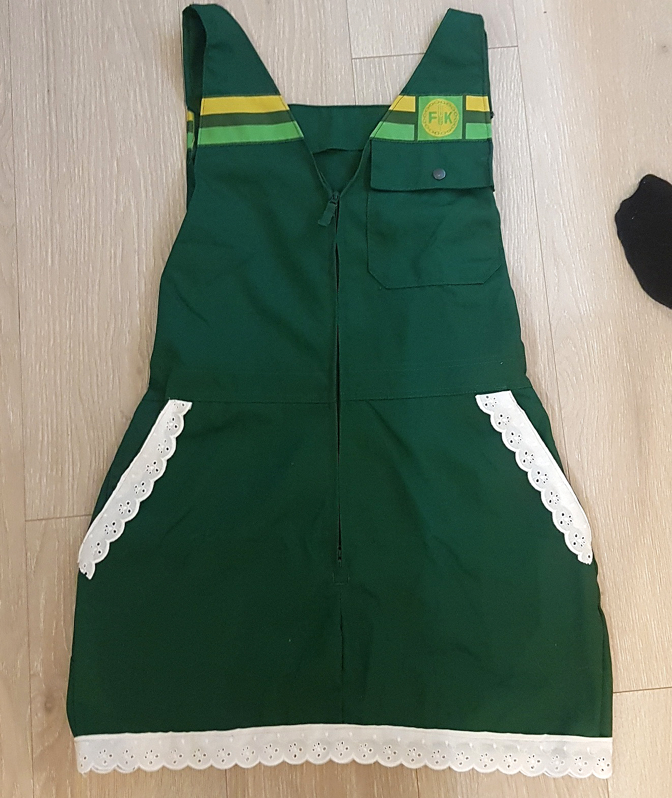 – Jeg klipte rett og slett til kjolen i ønsket fasong og formsydde den til min egen fasong. Glidelåsen forkortet jeg så det ble en V-hals. Det var viktig å beholde FK-logoen. Jeg fant hvite bånd på en gjenbruksbutikk, som jeg sydde på i bunnen og på lommene framme og bak. I kombinasjon med hvit topp, knesokker og pumps ble det et antrekk som slo virkelig godt an hos både kunder og leverandører, forteller Bergslid.