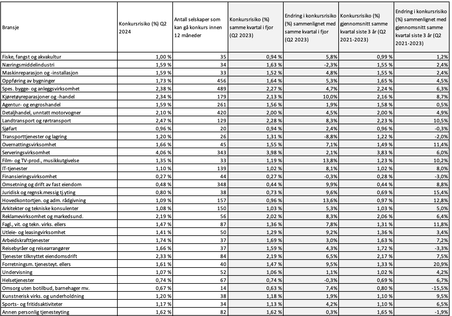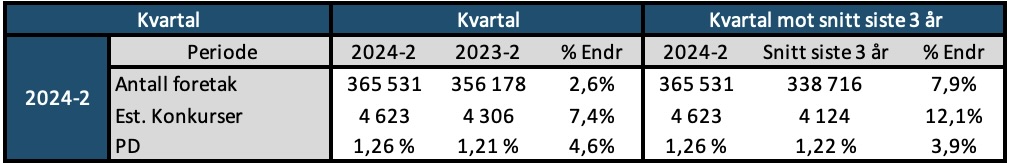 Konkursrisikoen, representert ved andelen estimerte konkurser i forhold til totalt antall foretak, ligger rett over 1.2 prosent. Det er en økning på 4.6 prosent sammenlignet med samme periode 2023.