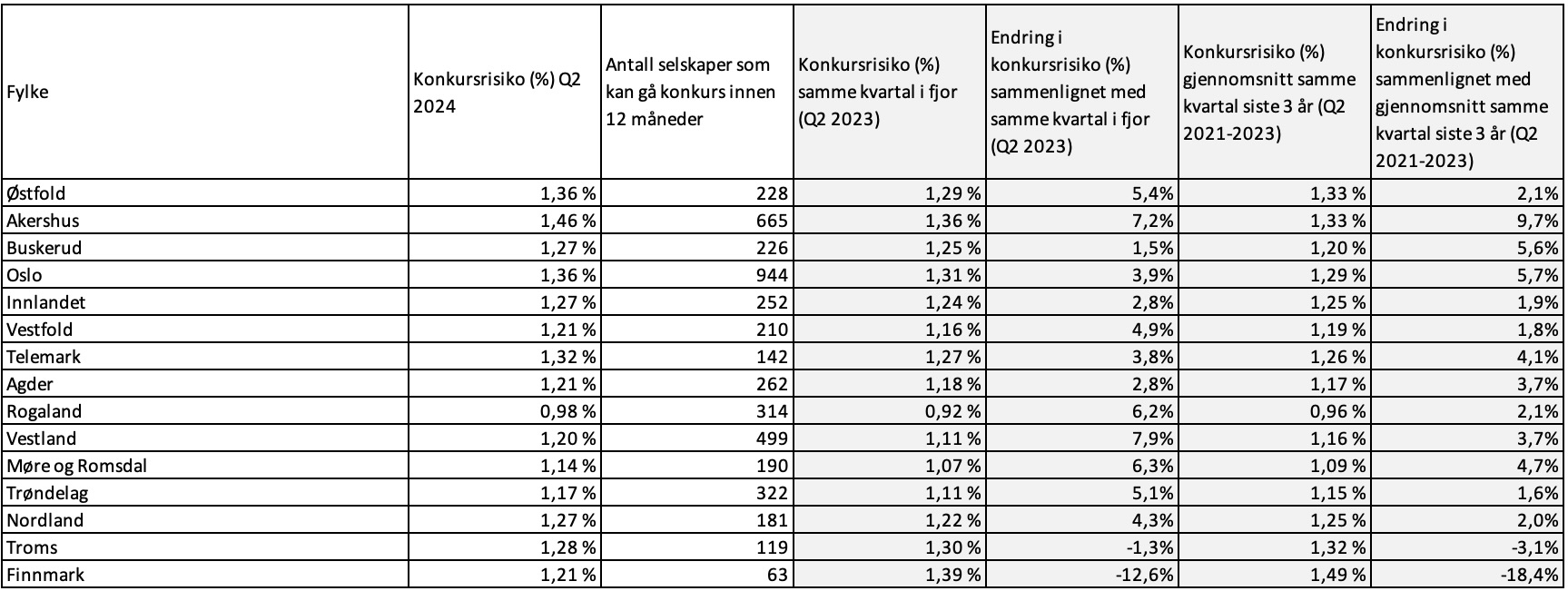 Etter andre kvartal 2024 er Akershus det fylket med den største prosentvise økningen i konkursrisiko, sammenlignet med gjennomsnittet for samme periode de siste tre årene.
