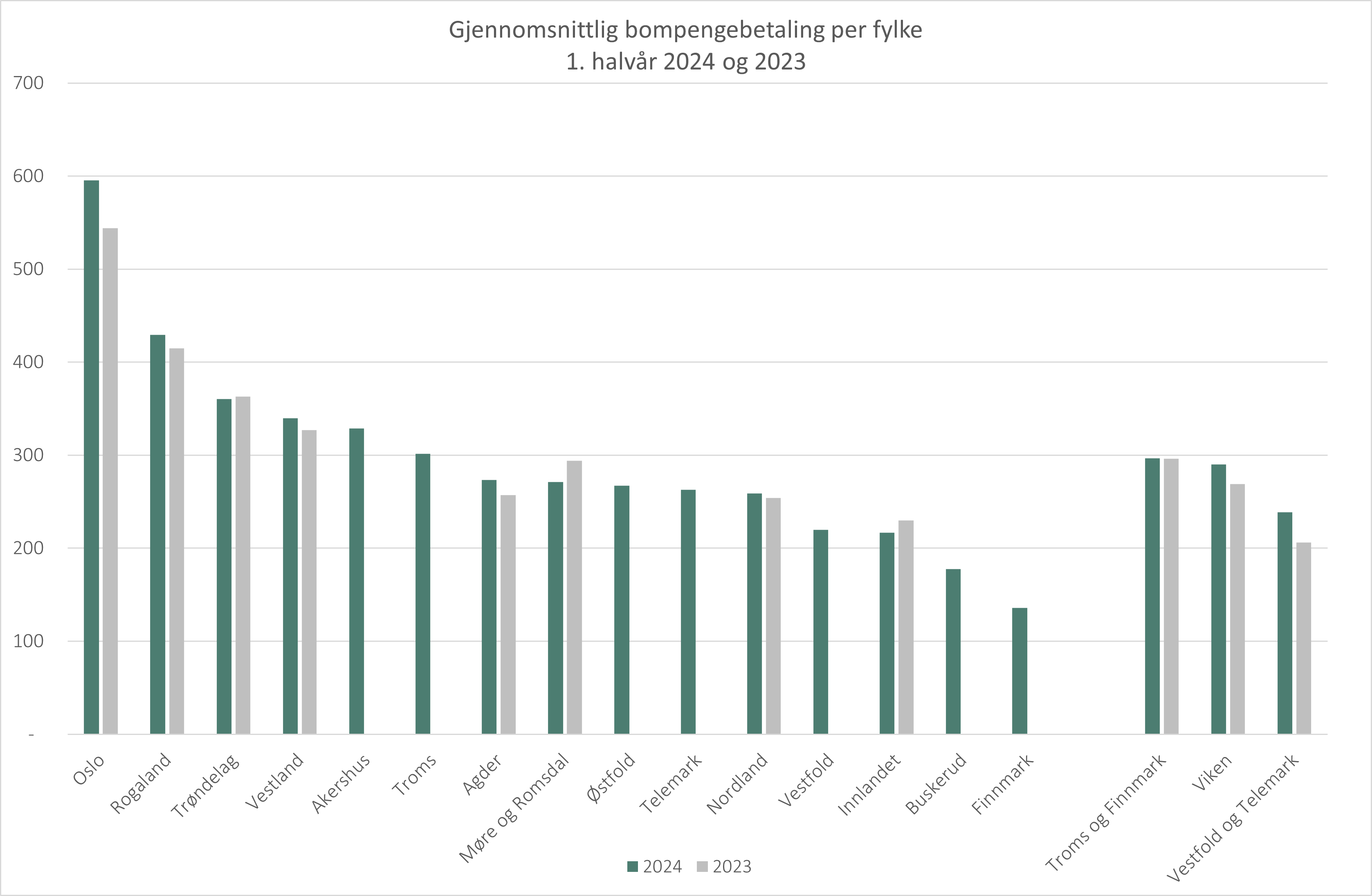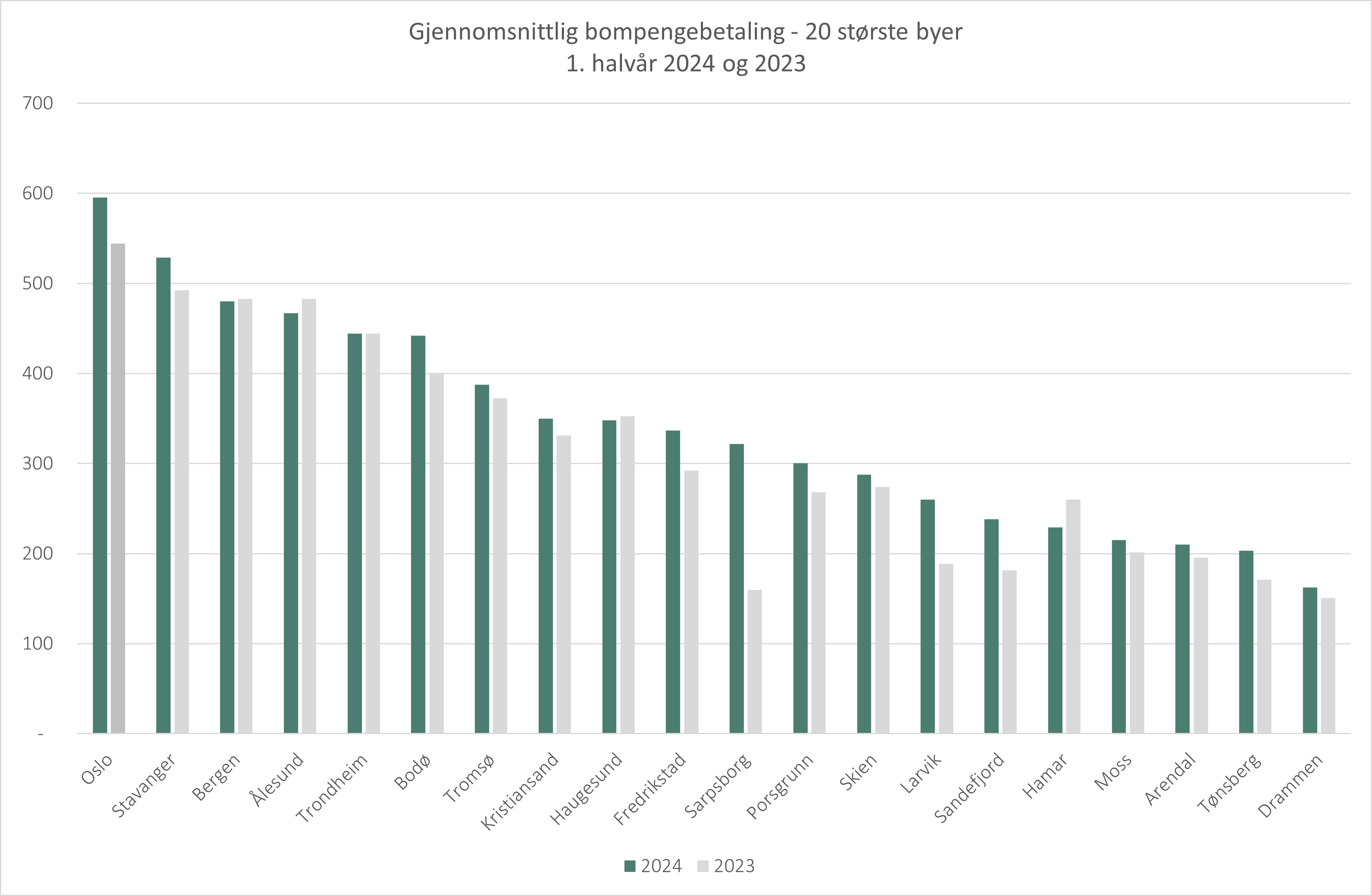 Blant de store byene er det fortsatt Oslo som troner på topp i bompengebetaling. Gjennomsnittbilisten i Oslo betalte 51 kroner mer per måned i 2024, sammenlignet med 2023. Gjennomsnittlig bompengebetaling i Oslo i første halvår er 595 kroner per måned.