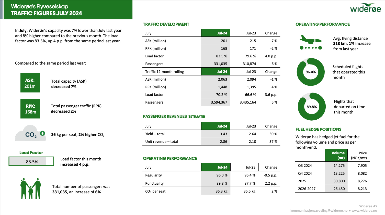 -Jeg vil samtidig rette en stor takk til alle kollegaer i Widerøe som sammen har trukket lasset gjennom en arbeidskrevende sommer, stilt opp på fridager og bistått kollegaer når det var behov. At tallene ser så bra ut for juli er alles fortjeneste, avslutter Skaug.