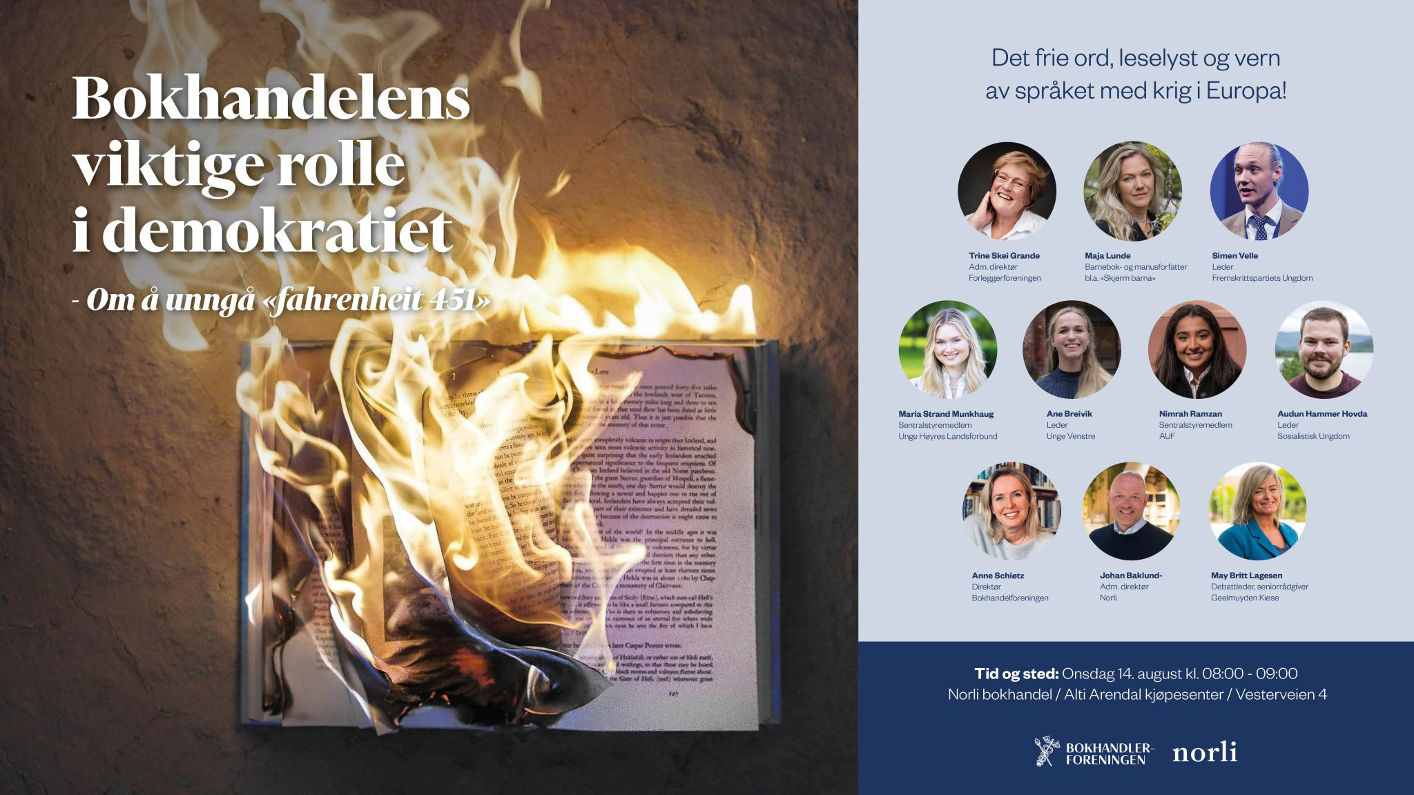 – Det skal bli spennende å høre hva fremtidens politiske ledere tenker om temaet vi setter på agendaen, sier Johan Baklund. Vi må for enhver pris unngå en situasjon som beskrevet i boken og filmen «Fahrenheit 451». Med 204 bokhandler fra sør til nord og 2.000 ansatte har vi en viktig rolle for å bidra til samfunnsutviklingen. I en tid med krig i Europa og Ukraina ser vi at det frie ord plutselig er truet. Det å delta i samfunnsdebatten i Arendalsuka er derfor viktig for oss i Norli, som landets største bokhandlerkjede.
