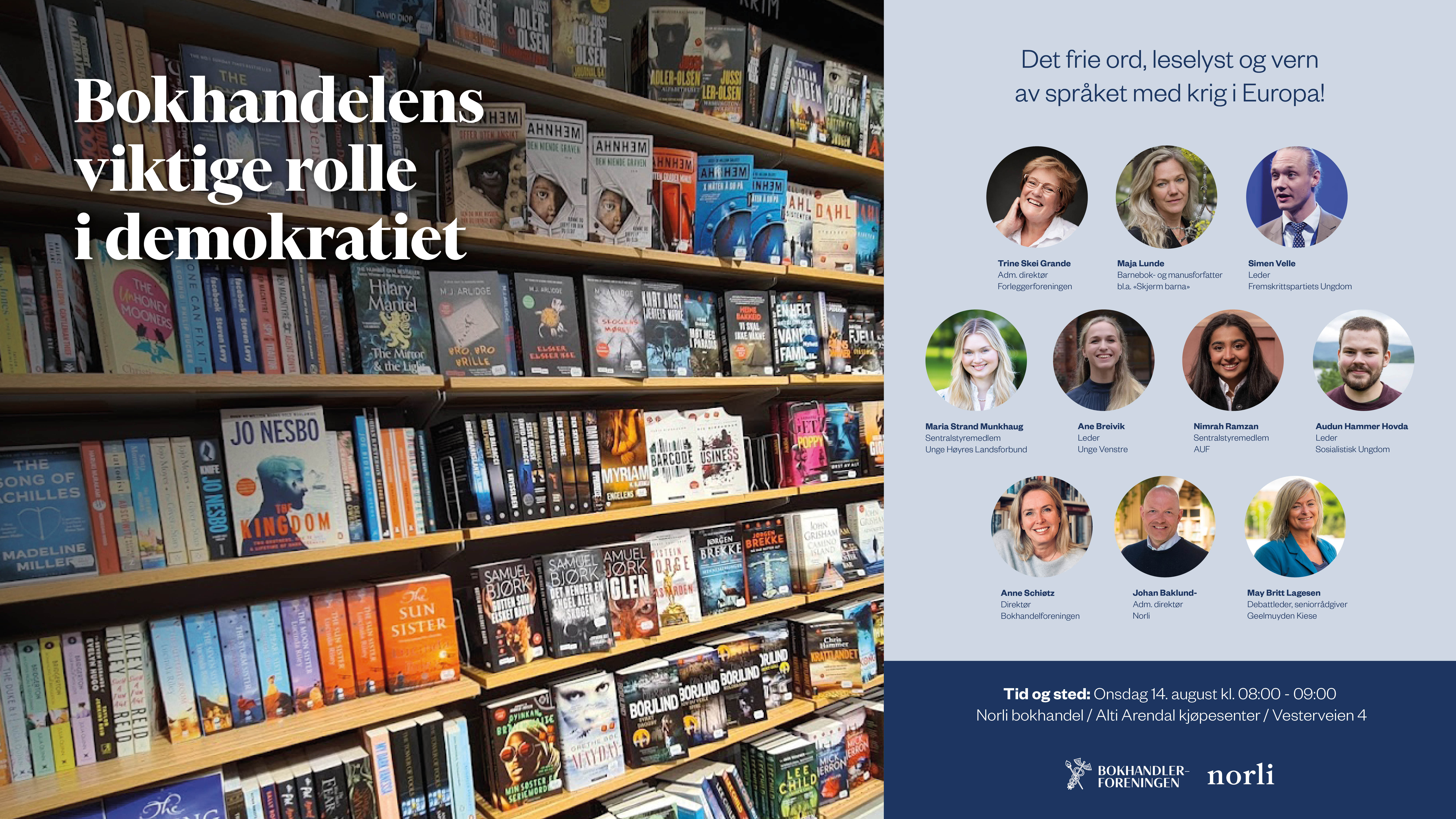 Leselyst og bokhandlerens viktige rolle i demokratiet blir tema for en debatt og frokostmøte i Norli bokhandel i Alti kjøpesenter på onsdag kl. 08.00 – 09.00. I debattpanelet deltar vår fremtid i form av noen av landets fremste ungdomspolitikere.