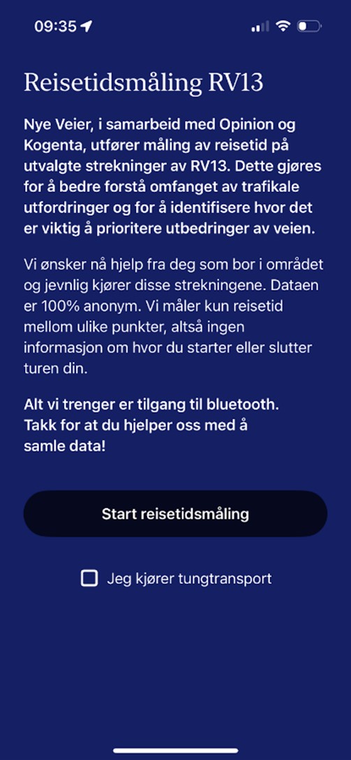 - Nye Veier, i samarbeid med Opinion og Kogenta, utfører måling av reisetid på utvalgte strekninger av riksvei 13 fra kryss E134 til Hardangerbrua, samt langs Sognefjorden frem til Sogndal.. Dette gjøres for å bedre forstå omfanget av trafikale utfordringer og for å identifisere hvor det er viktig å prioritere utbedringer av veien. Nå har vi laget en app, som vi håper veifarende i området vil ta i bruk. Via blåtann registrerer appen reisetid mellom ulike punkter målt. Data som samles inn, er helt anonym, altså ingen informasjon om hvor du starter eller slutter turen din. Alt i henhold til personvern er ivaretatt, forklarer planprosjektleder Lohne.