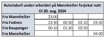 Siste avgang frå Mannheller før arbeida startar blir klokka 23.00, medan siste avgang frå Fodnes blir 22.40.