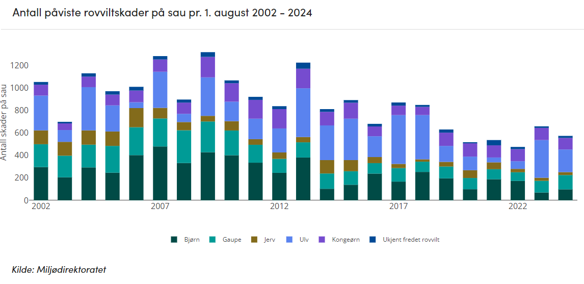 Per 1. august var det meldt inn 1521 skadde eller døde sauer hvor rovvilt var mistenkt skadevolder. Av disse viser undersøkelser gjennomført av SNO, at 573 sauer har blitt skadd eller drept av rovvilt. Dette er lavere enn fjorårets tall og på linje med de tre foregående år.