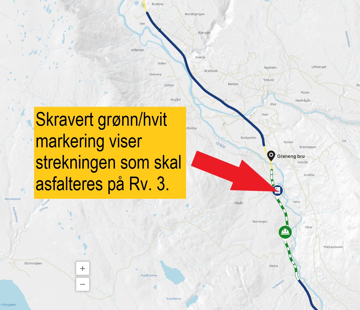 I og med det samtidig vil pågå utbedringsarbeider på rv. 3, der asfalteringen avsluttes og 2 kilometer sørover, blir det anleggstrafikk og redusert hastighet på et langt område.