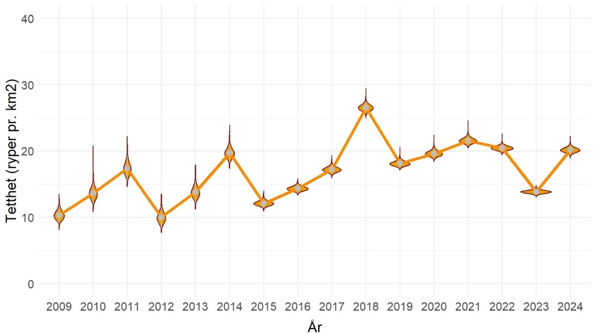 – Bestanden har på landsbasis økt fra i fjor til år. Samlet sett er 2024 et av de bedre årene de siste femten årene, men det er betydelig variasjon mellom landsdelene. Vi ser at bestanden har økt ganske kraftig i Nordland og Troms, og at det står bedre til i mye av Midt- og Sør-Norge etter et svært dårlig rypeår i fjor. I Finnmark går bestanden samlet sett noe tilbake etter et meget godt år i fjor, sier Erlend B. Nilsen, prosjektleder for Hønsefuglportalen, seniorforsker ved NINA og professor i økologi ved Nord universitet.