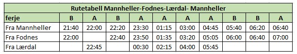 Frå klokka 21.40 til 05.40 vil det gå ferje mellom Lærdal til Mannheller og Fodnes. Sjå rutetabell her.