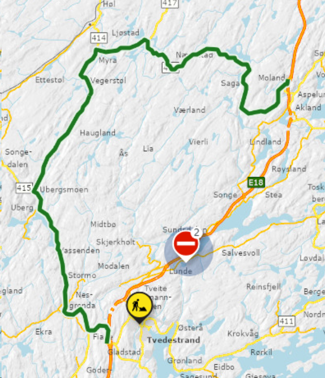 I dag tidlig ble fylkesvegen via Laget nevnt som omkjøringsveg, men Statens vegvesen fraråder å bruke denne vegen for E18-trafikk og ber trafikanter benytte den nevnte omkjøringsvegen som er skiltet.