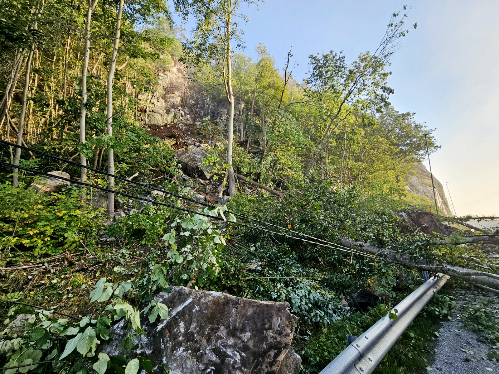 – Status nå er at vi har geolog og geotekniker på stedet for å vurdere skredet. Vi og vår entreprenør kan ikke gå inn i skredområdet før vi har fått klarsignal, sier Ina Rognlid, byggeleder i Statens vegvesen.