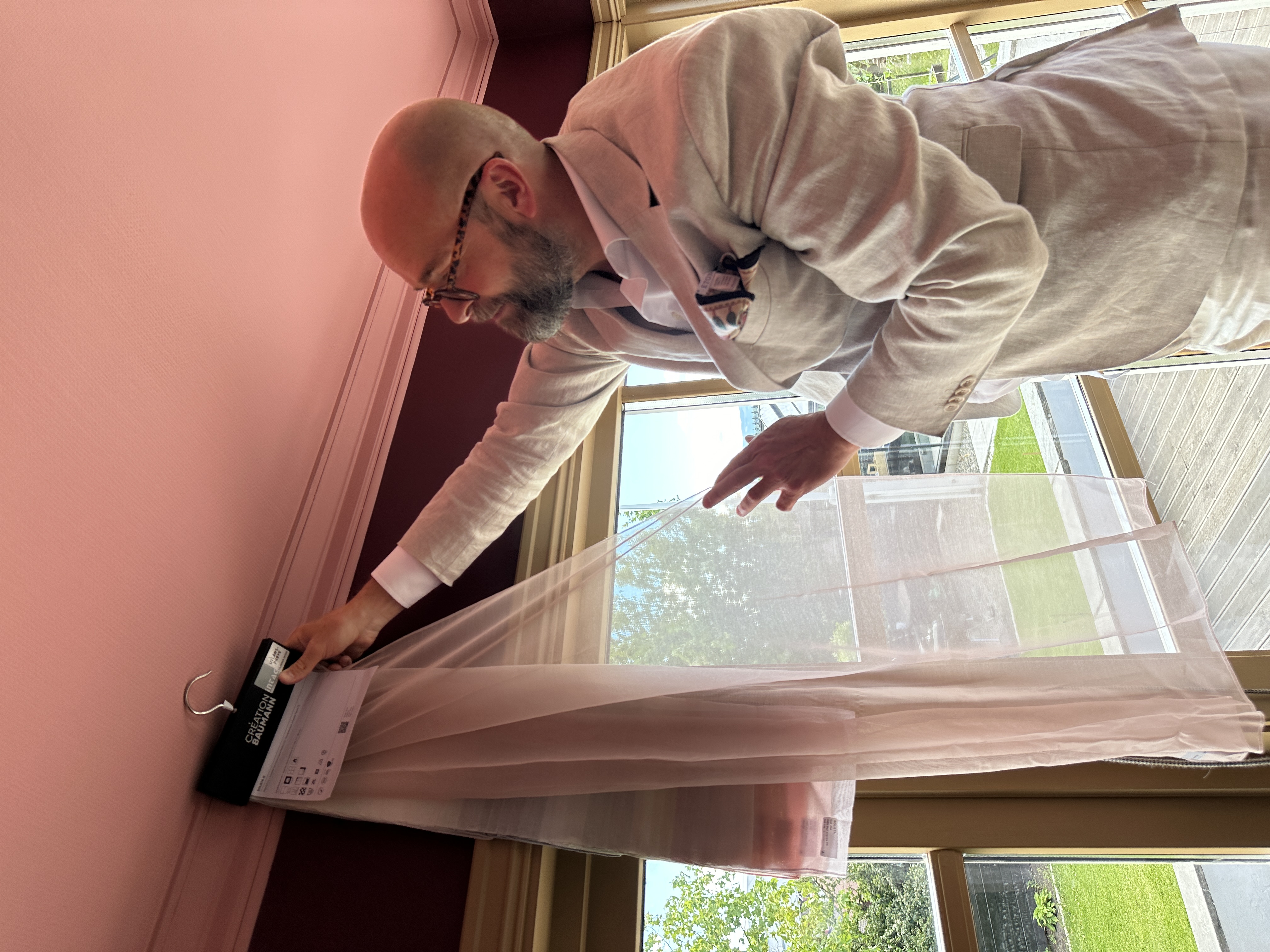 Plutselig når Wollans entusiasme nye høyder, når et tekstil med rosa bjørkestammemønster kommer frem mot veggen.