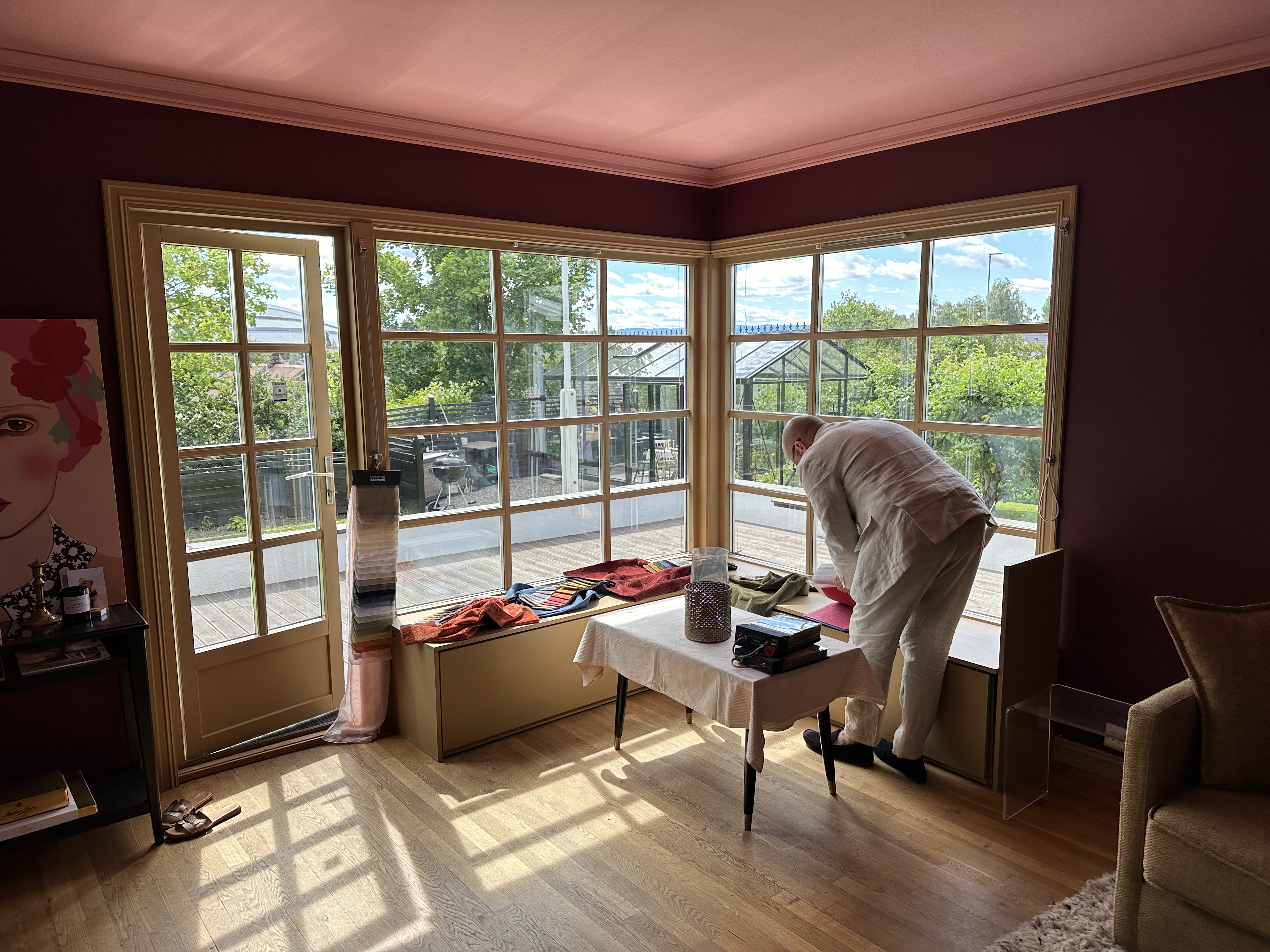 I tillegg til det rosa taket og vinrøde veggene, er det valgt en litt skitten, gylden farge på listverk, dører og vindu, skal det tas hensyn til et gammelt parkettgulv, og møbler som ikke skal byttes ut.