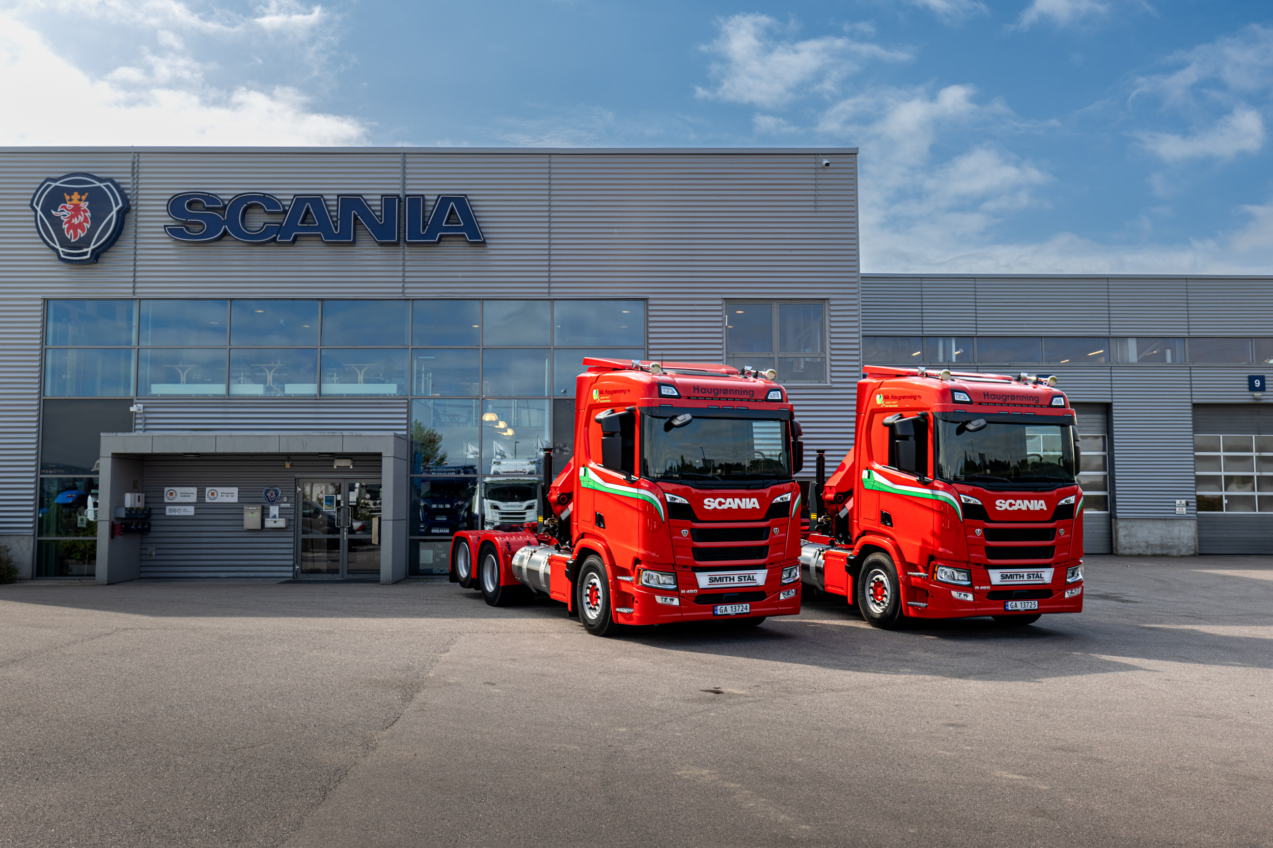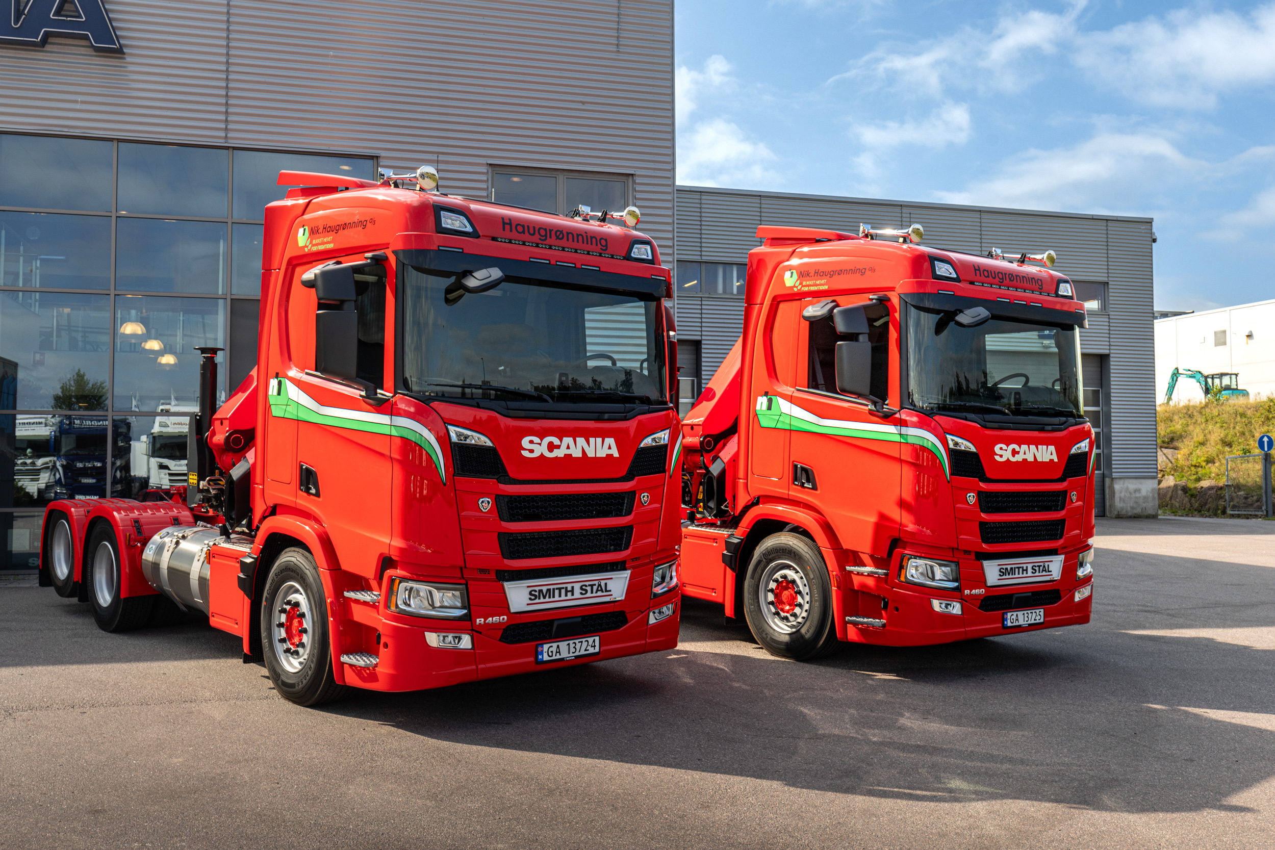 Nik. Haugrønning as har fått levert de to første av fem identiske Scania R 460 trekkvogner med kran og flytende biogass (LBG) som klimavennlig drivstoff, til sin avdeling i Holmestrand.