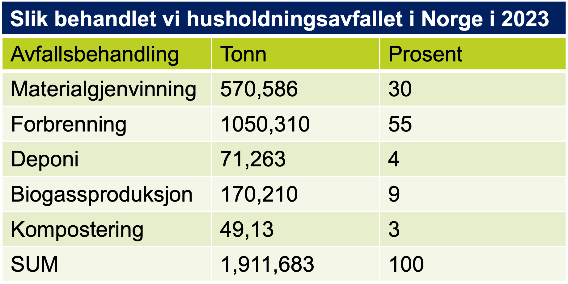 I 2009 gikk 49 prosent av alt avfall som ble samlet inn og behandlet til forbrenning. Ti år senere var dette økt til 65 prosent.