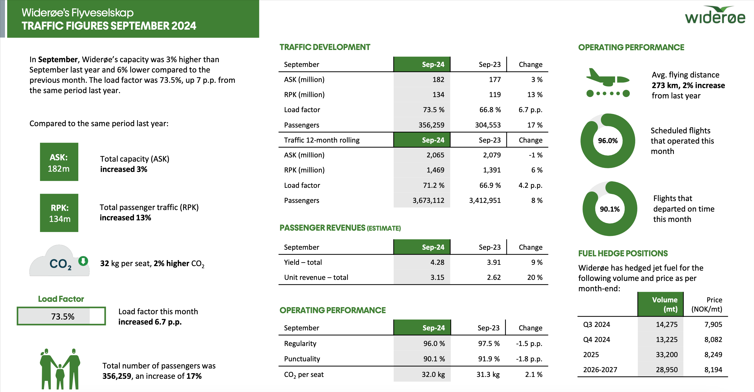 September ble nok en historisk måned for Widerøe. Aldri før i løpet av selskapets 90 år lange historie, har så mange passasjerer flydd med flyselskapet på én enkelt måned. Med en reduksjon av kapasitet på seks prosent mot forrige måned, og knappe tre prosents økning sammenlignet med samme periode i fjor, endte det totale antall passasjerer for september måned på 356.259 passasjerer. Det betyr en passasjerøkning på 17 (!) prosent. Til tross for kun en marginal økning av produksjonen mot fjoråret utgjorde kabinfaktoren totalt 73,5 prosent. En økning av fyllingsgraden på flyene på 6,7 prosentpoeng mot september 2023. Produksjonen målt i ASK er opp 3 prosent.