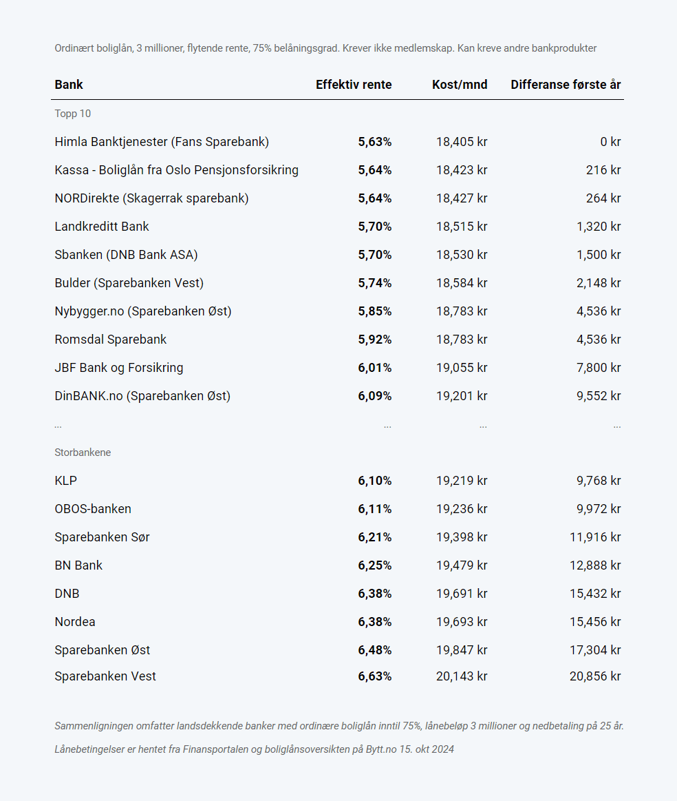 Undersøkelsen tar utgangspunkt i et vanlig boliglån på 3 millioner kroner med en nedbetalingstid på 25 år, og inkluderer ikke mindre lokalbanker.