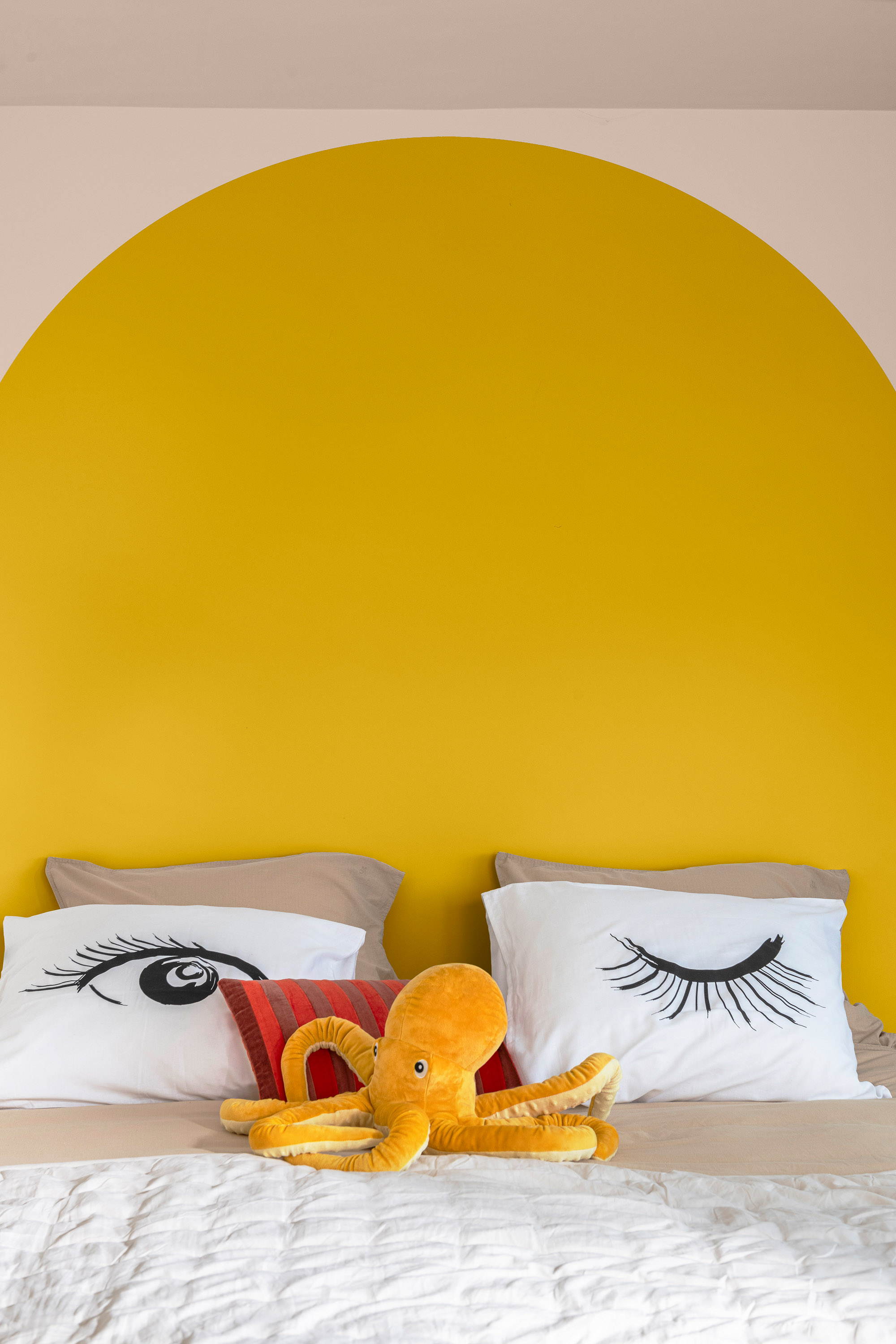 Et soverom med en malt gul bue over sengen, puter med øyemønster, og en oransje blekksprut-kosedyr.