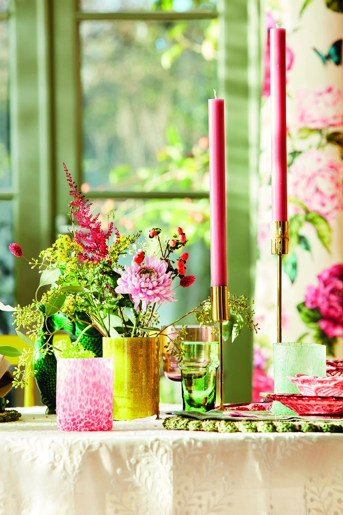Et bord med fargerike dekorasjoner i gult, rosa og grønt. Blomster og lysestaker står fremhevet.