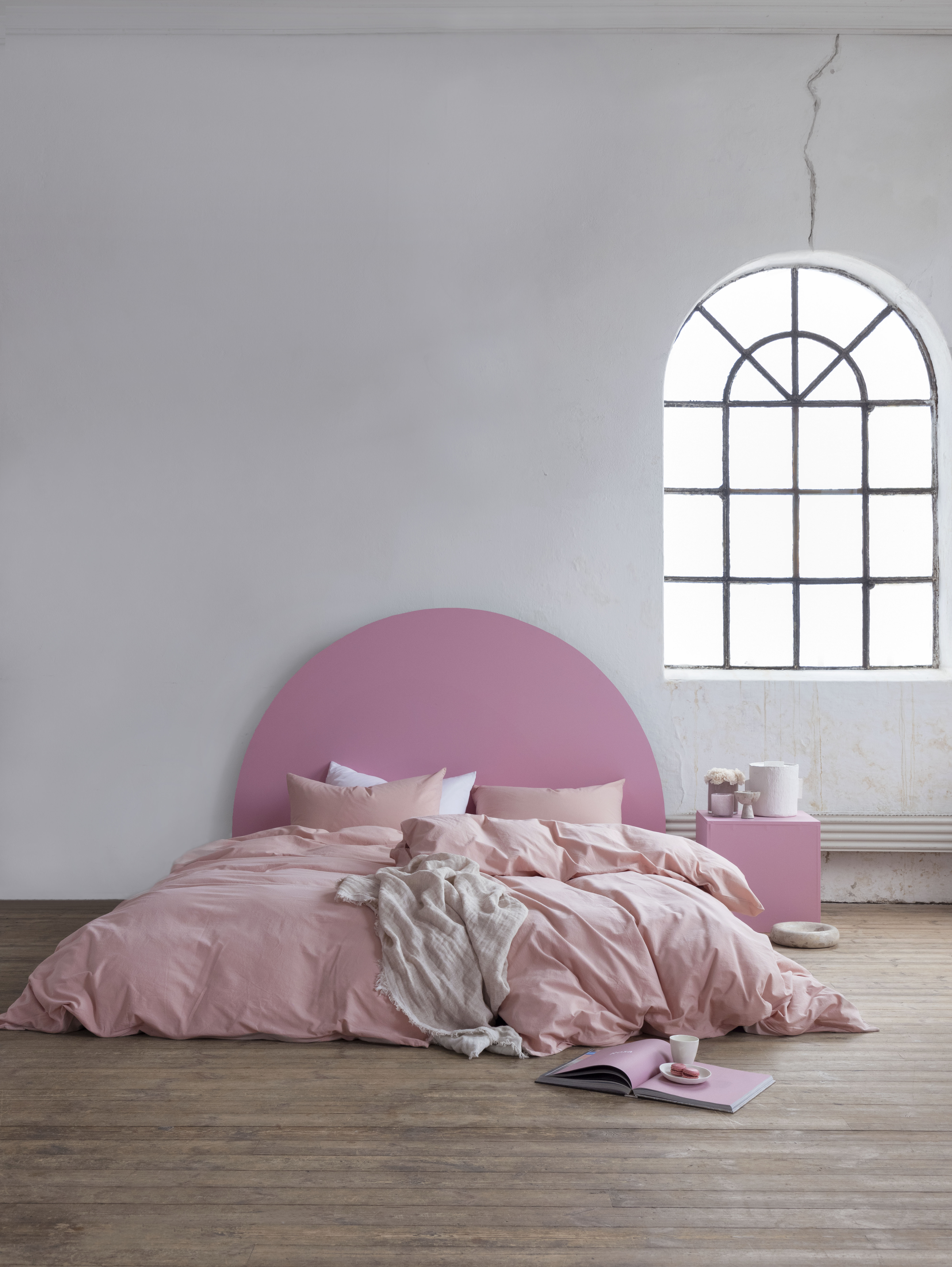 BUER: Enten det er den faktiske sengegavelen, eller en malt bue bak sengen, så er dette en morsom måte å myke opp uttrykket. Her med rosa sengesett fra Norsk Dun.