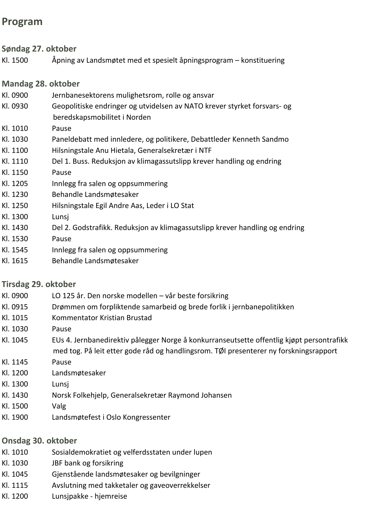 I tillegg til ordinære saker vil også samferdselspolitikk, beredskap, gods på bane, bussjåførens hverdag, klima, jernbanereformen og EUs jernbanepakker få en sentral rolle.
