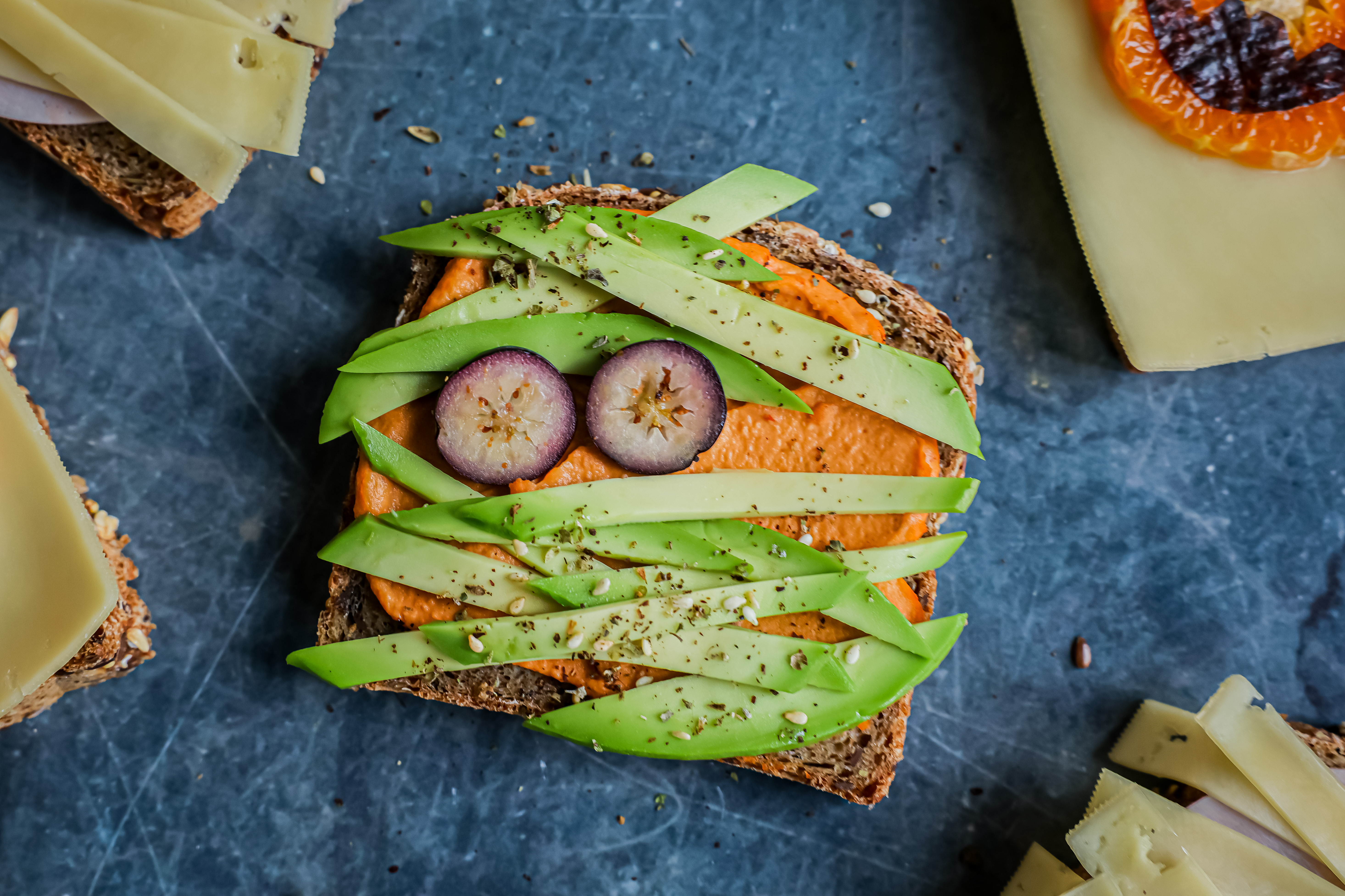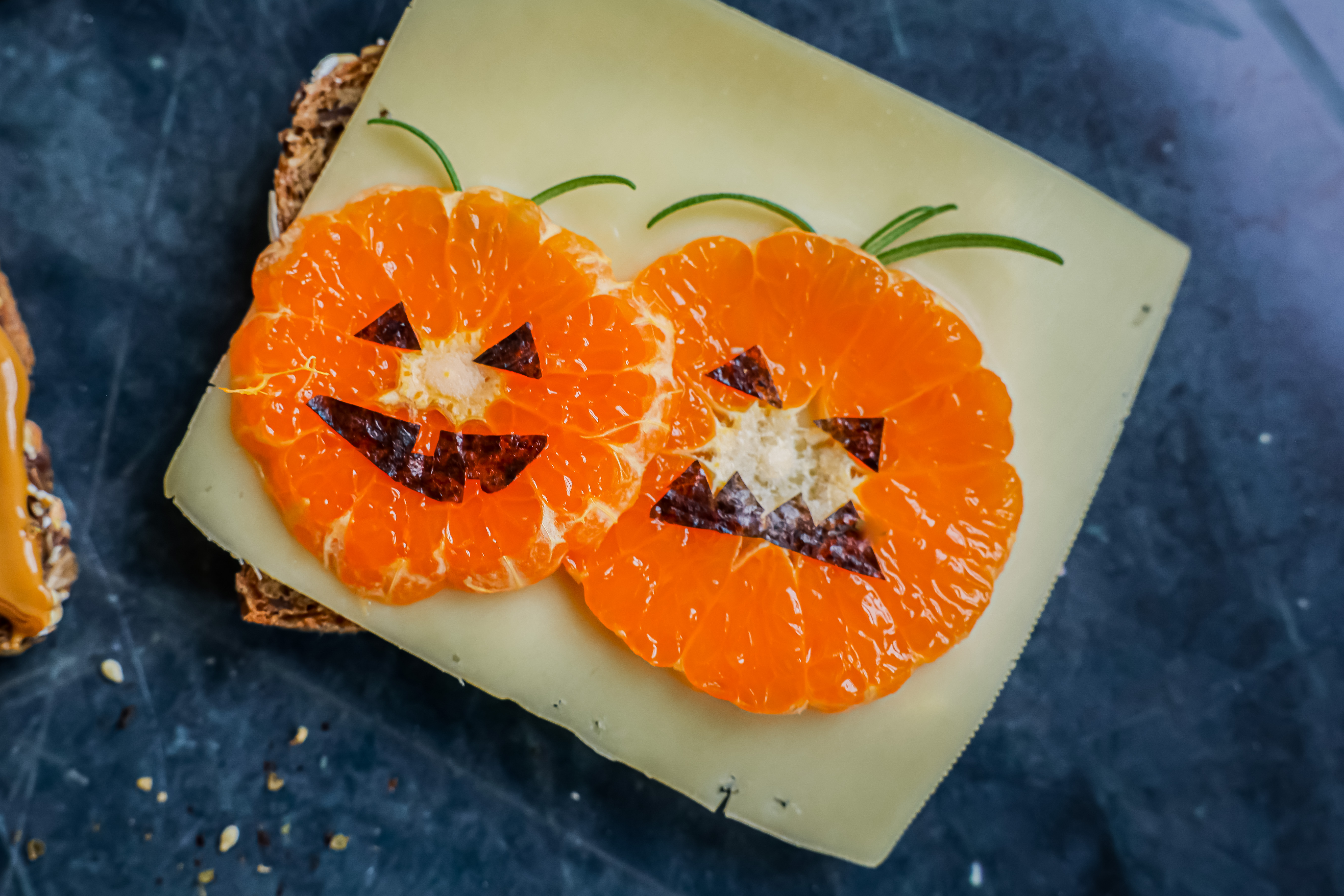 På brødskiven med gulost lager du fort et skummelt gresskaransikt. Bruk skiver av klementin, klipp ut munn og øyne av noritang og bruk et blad av rosmarin eller annen krydderurt som stilk.