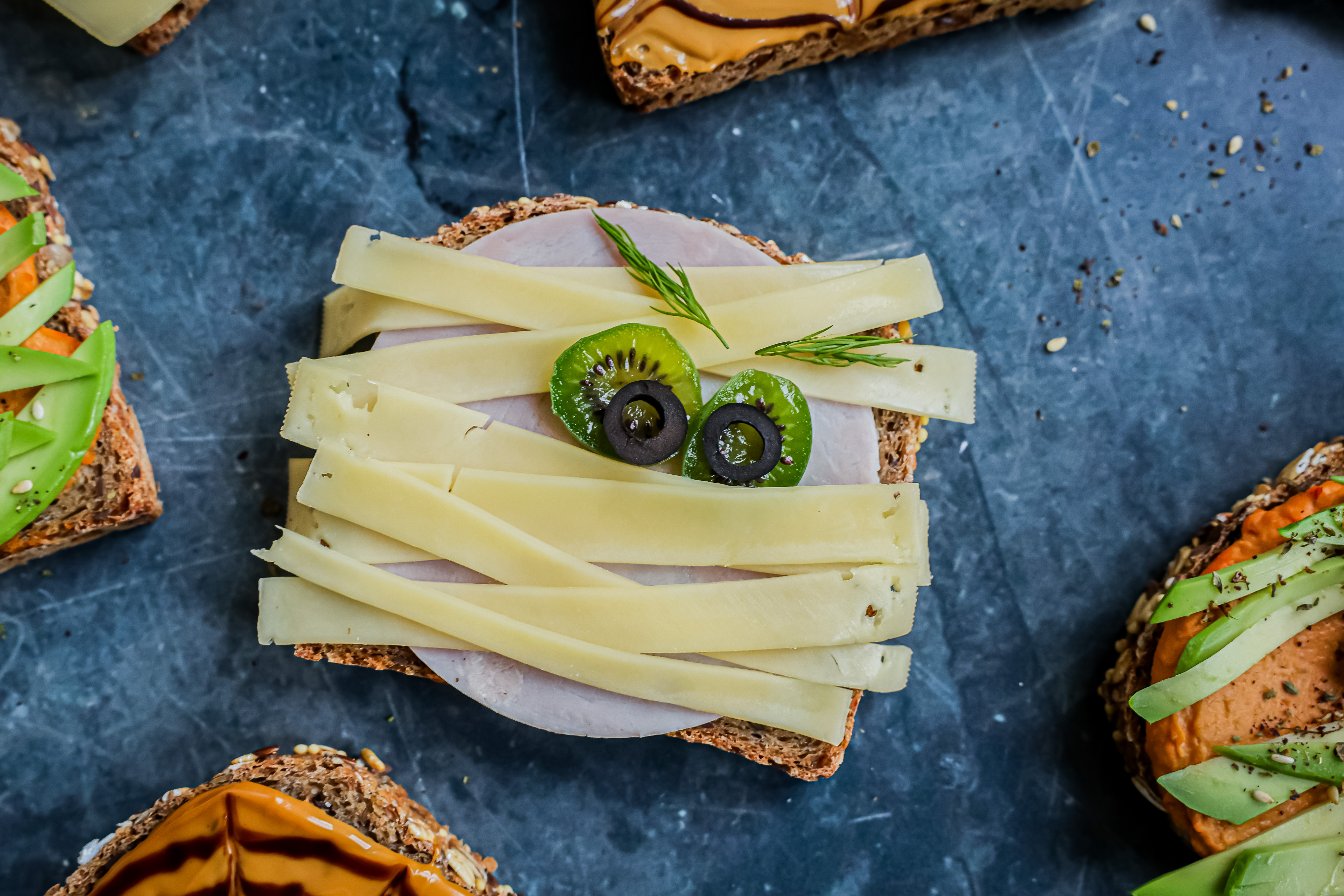 Eller ved å pynte en brødskive med skinkepålegg med ostebånd og øyne av minikiwi og skiver av sorte oliven.
