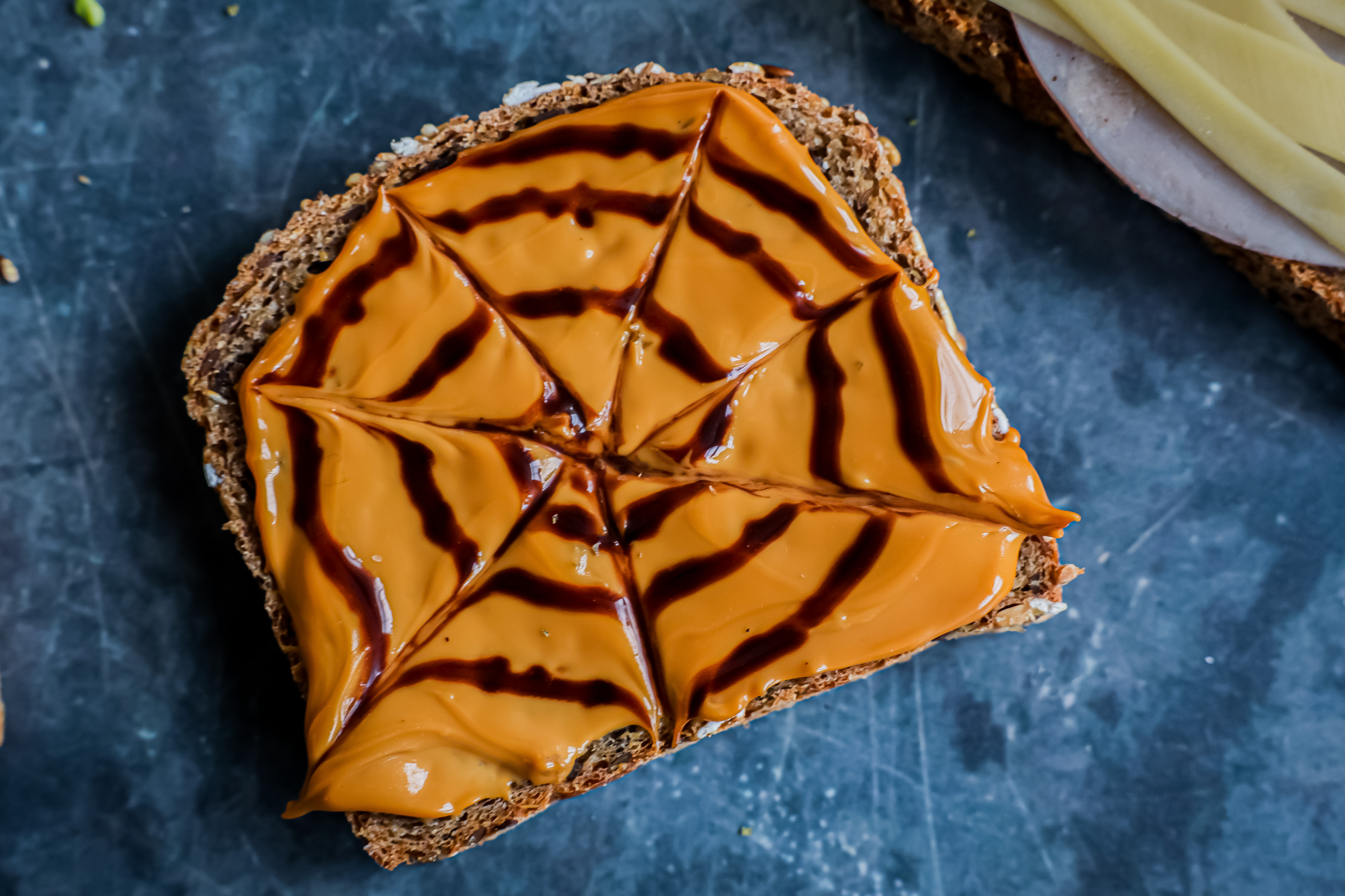 Tegn en spiral med sjokoladeglasur på brødskiven med prim eller peanøttsmør. Bruk en spiss kniv eller en tannpirker og dra forsiktig fra midten av skiven og ut mot alle sidene slik at det danner et mønster som ligner edderkoppspinn.