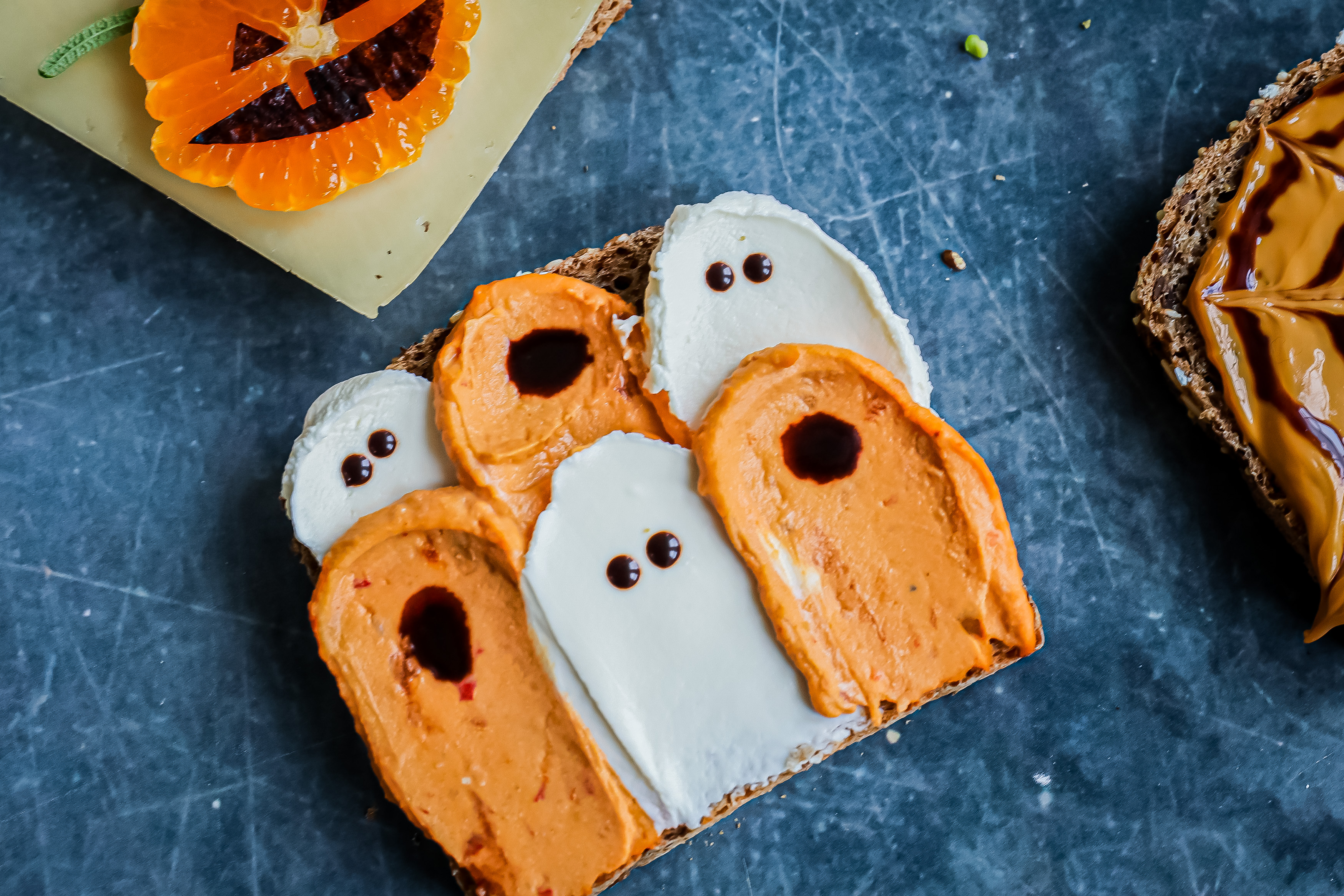Med orange hummus, gjerne av gresskar, og kremost lager du kjapt små spøkelser. Øyne kan tegnes på med balsamicosirup eller ved å sette på små sjokoladekuler.