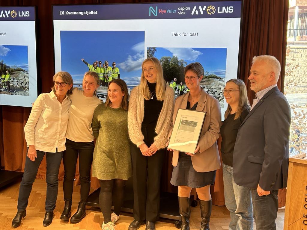 På BREEAM Infrastructure Assessorsamling hos Grønn Byggallianse onsdag 30. oktober mottok Nye Veier, sammen med totalentreprenør LNS AS (Leonhard Nilsen & Sønner AS), og rådgivere fra Rambøll/Henning Larsen og Asplan Viak, sertifikatet for BREEAM Infrastructure til Excellent for prosjektet E6 Kvænangsfjellet.