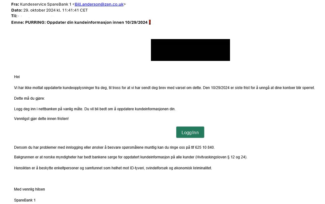 Svindlere utgir seg nå for å være fra SpareBank 1 og forsøker å stjele innloggingsopplysningene dine. De sier i en e-post at du må oppdatere kundeopplysningene og sender så en påfølgende purring.