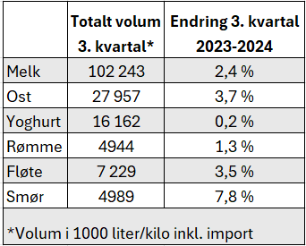 Det var en økning i samtlige meierikategorier i årets 3. kvartal, der melkesalget isolert sett økte med 2,4 prosent, sammenlignet med samme periode i fjor. Det gjør kvartalet til det beste på flere år for melkekategorien, og sett vekk fra 2020, det beste på flere tiår.