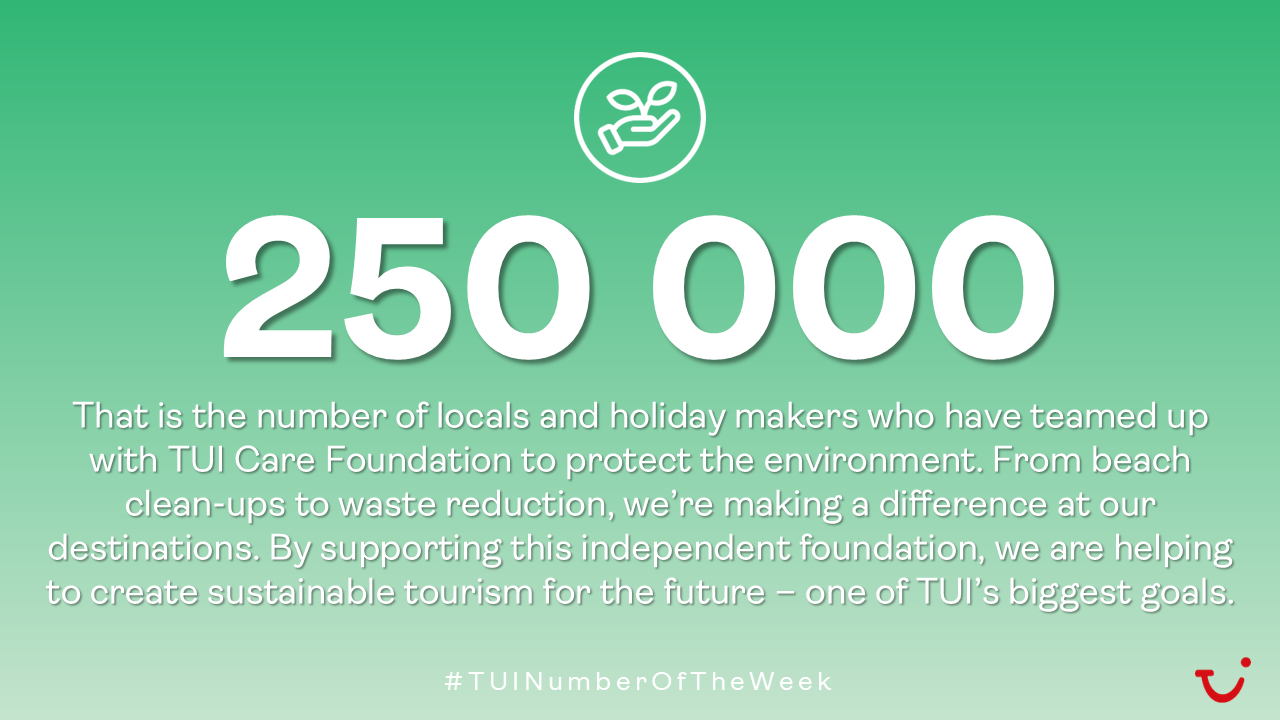 Det er antallet frivillige som bidrar inn de mange ulike prosjektene til TUI Care Foundation hvert eneste år. Målet for alle prosjektene er å bidra til en mer bærekraftig reiselivsnæring. Både turister og lokalbefolkning bidrar med for eksempel strandrydding eller å plante ny skog på reisemål verden over.  Et av de viktigste målene til TUI er å sørge for at også fremtidige generasjoner kan oppleve verden. Ved å støtte den uavhengige stiftelsen ,TUI Care Foundation, jobber vi sammen for å få til dette.