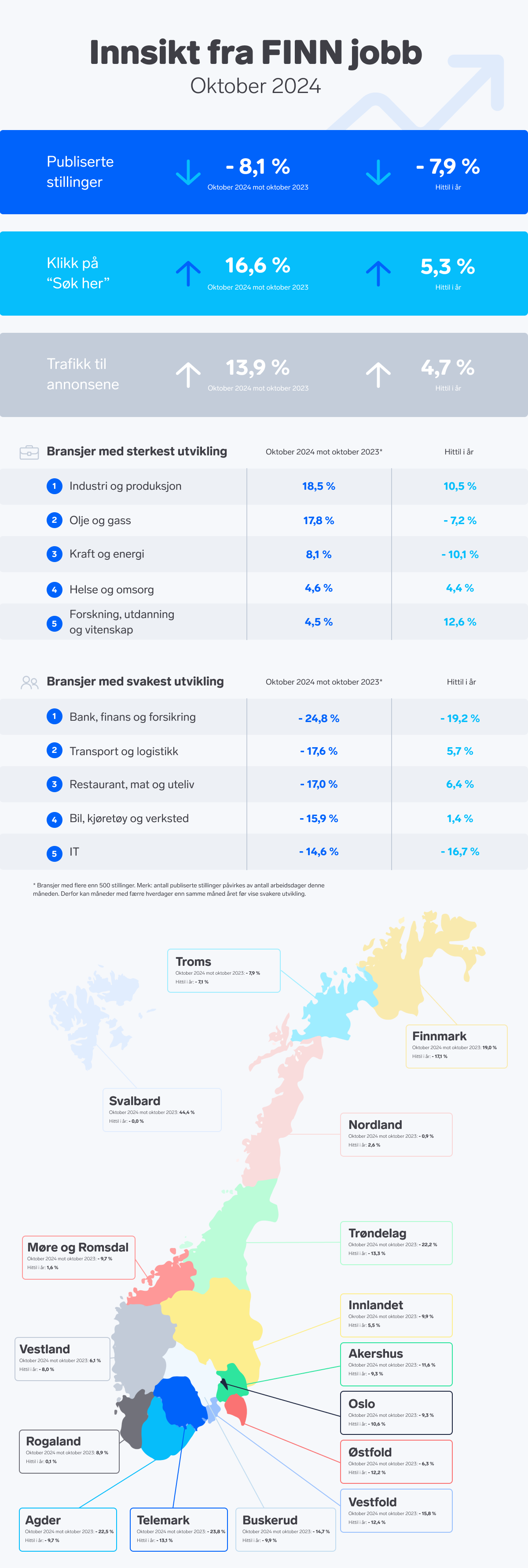 – Det er fortsatt en negativ utvikling for bransjen Bank, finans og forsikring og de er en av bransjene med størst nedgang i stillinger på FINN, med nesten 25 prosent nedgang målt mot oktober i fjor. IT-bransjen har også vært hardt rammet i år og oktober har heller ikke vært en positiv måned for denne bransjen, med 15 prosent færre stillinger på markedet.