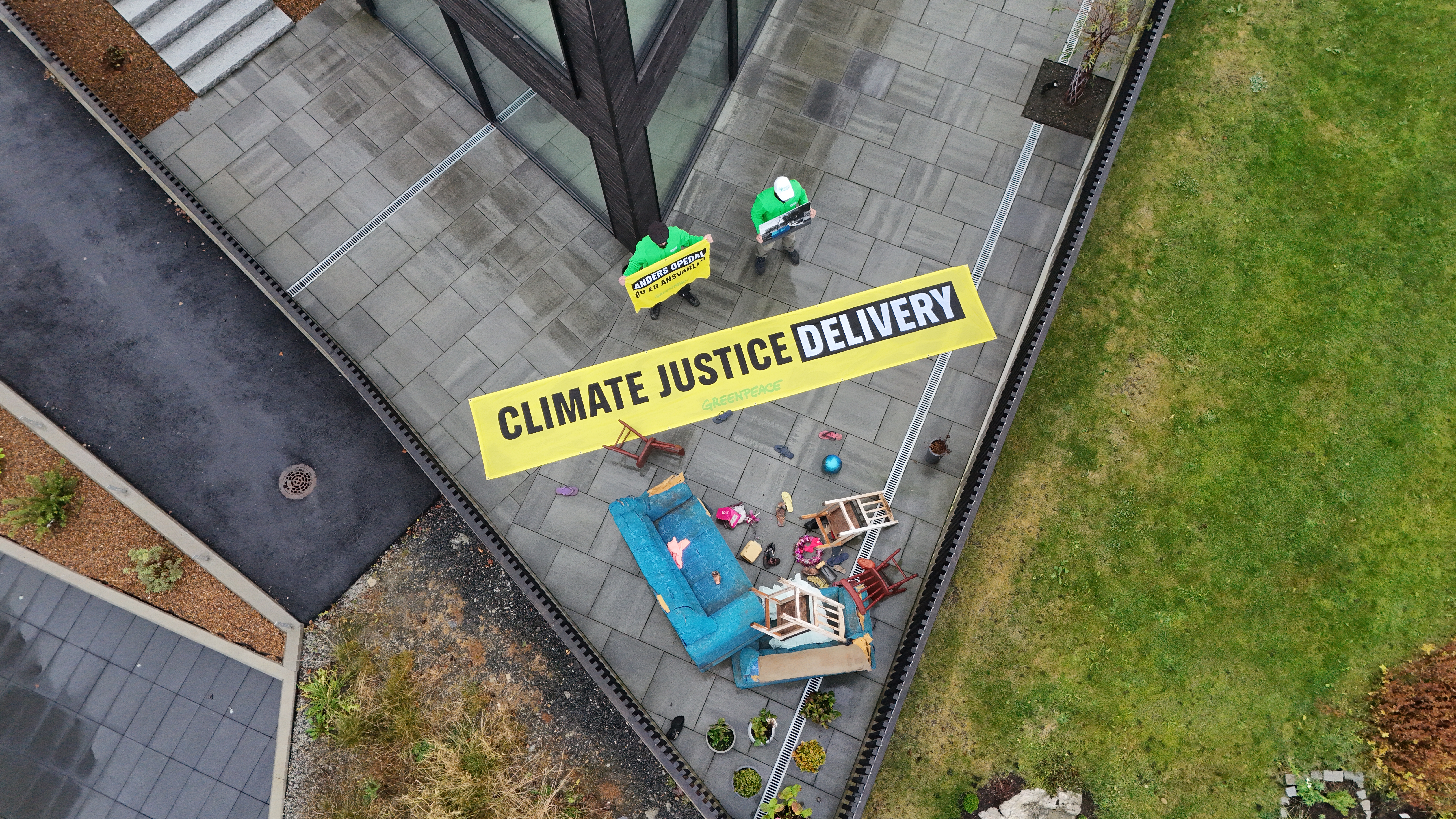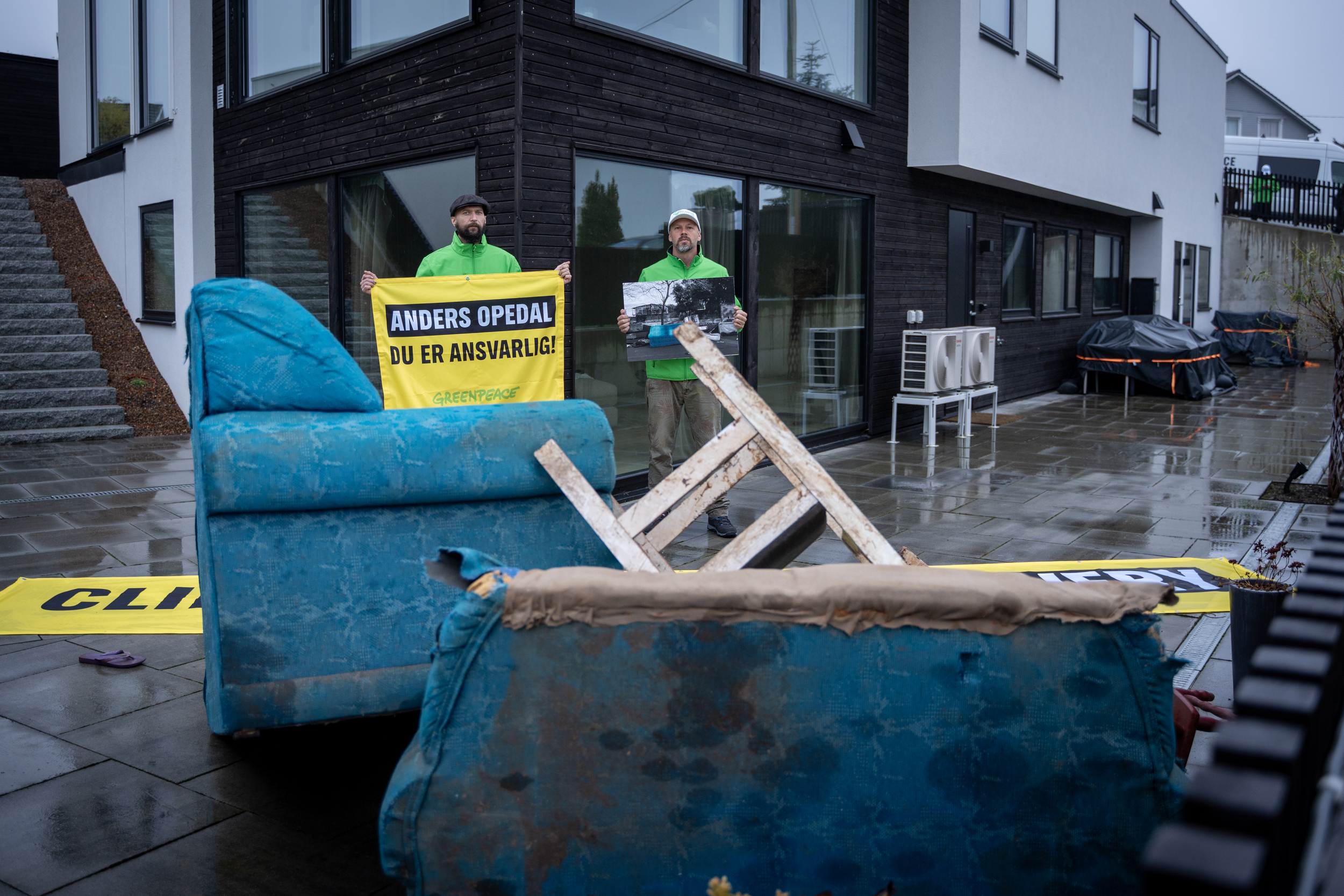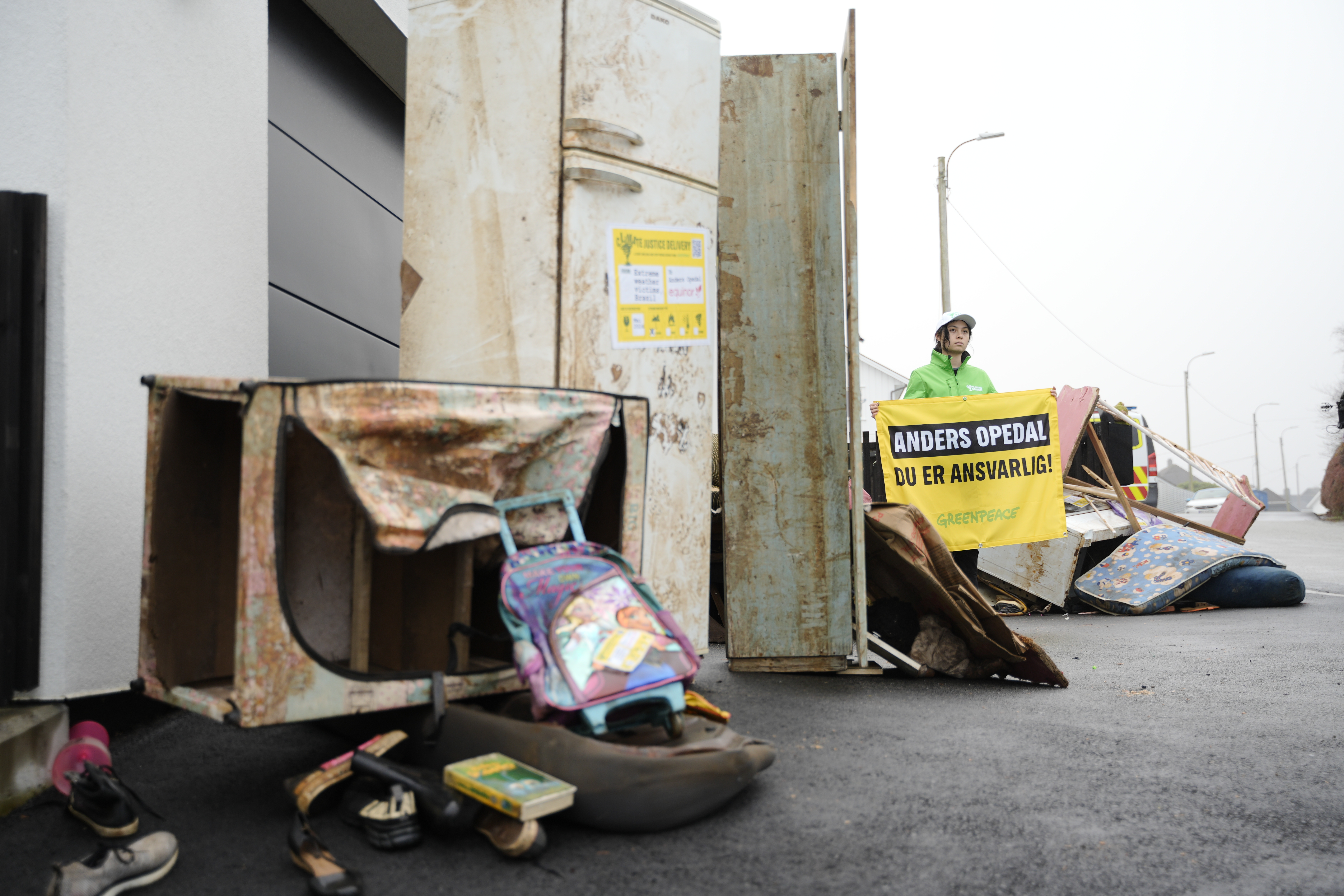Sandnes, 13. november – Rundt en halv million mennesker måtte forlate hjemmene sine under den dødelige flommen i Brasil i april-mai. Nå har aktivister fra Greenpeace Norden og Greenpeace Brasil plassert vrakrester fra ekstremværet rundt boligen til en av klimakrisens største pådrivere: oljesjef Anders Opedal.
