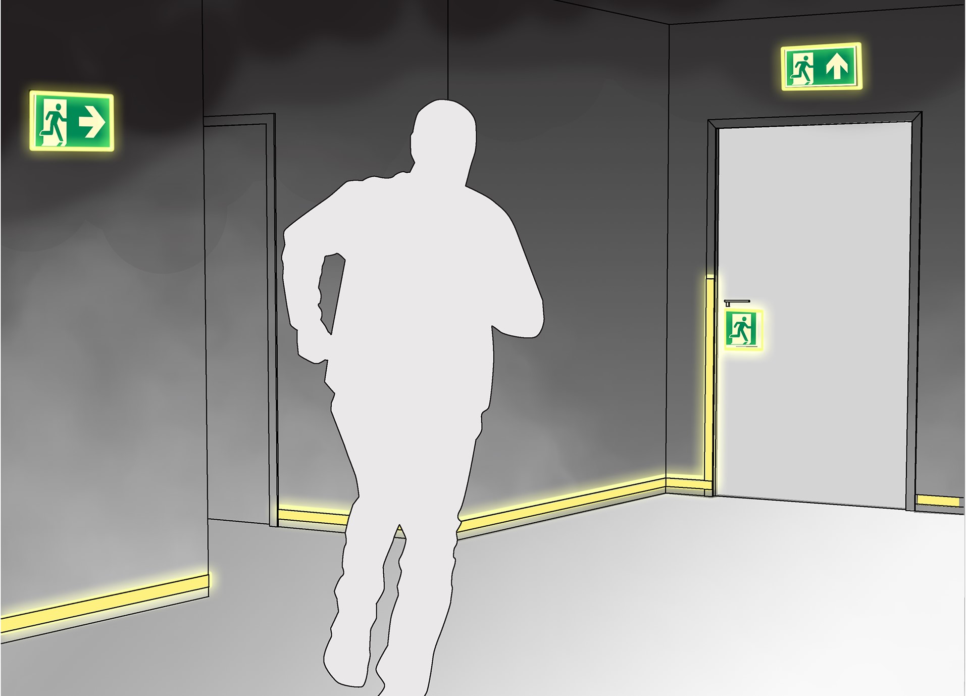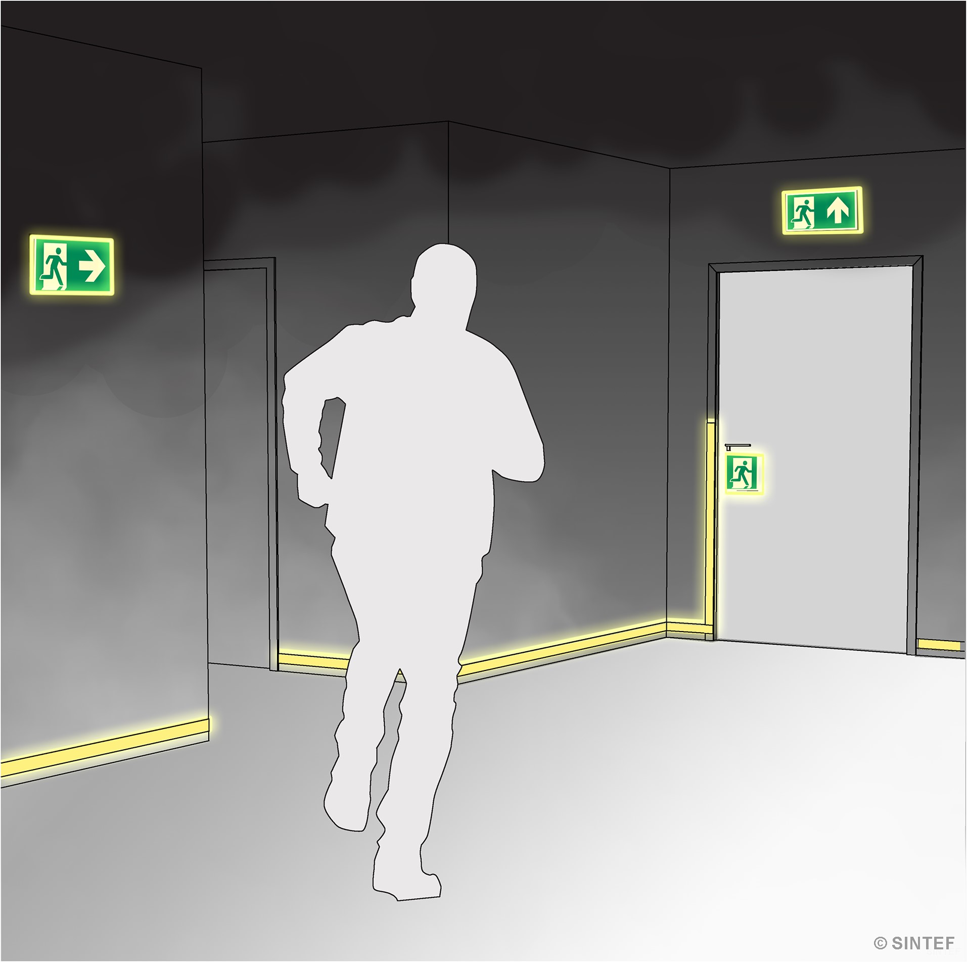 Når det brenner, gjelder det å komme seg raskt i sikkerhet. Byggforskserien beskriver utforming av ledesystem i flukt- og rømningsveier, samt andre tiltak som kan lette rømning fra bygninger.