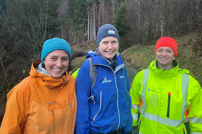 Flostranda har verdifull natur. Karianne Thøger Haaverstad (Multiconsult), Astrid Skrindo (NINA) og Ann Kristin Nes (Vestland fylkeskommune) på befaring på strekningen.