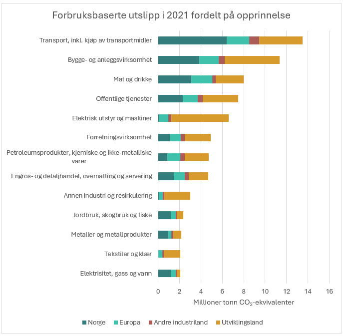 Ein tredel av utsleppa frå norsk forbruk i 2021 skjedde i Noreg, mesteparten frå bruk av bil og annan transport, aktivitetar innanfor bygg- og anleggssektoren, matforbruk og offentlege tenester.