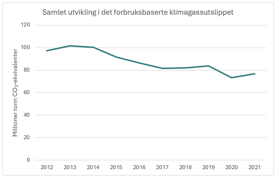 Det samla forbruksbaserte klimagassutsleppet i Noreg har vore fallande dei siste ti åra, med unntak av ein auke i 2019 og 2021. Frå 2012 til 2021, har det samla sett vore ein nedgang i det forbruksbaserte utsleppet på 21 prosent.