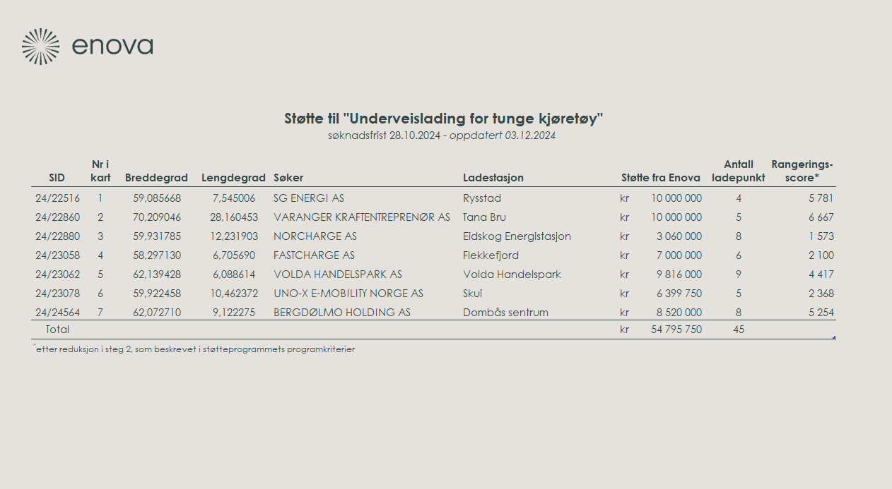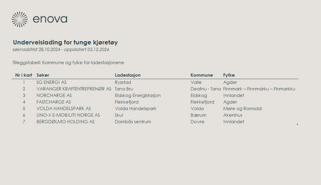 Det ble opprinnelig kommunisert at Enova tildelte støtte til 10 ladestasjoner. På grunn av en feil i saksbehandlingen måtte Enova imidlertid korrigere tilsagnet til tre ladestasjoner i denne søknadsrunden. Etter at feil ble avdekket, skal det korrekte tallet være sju ladestasjoner.