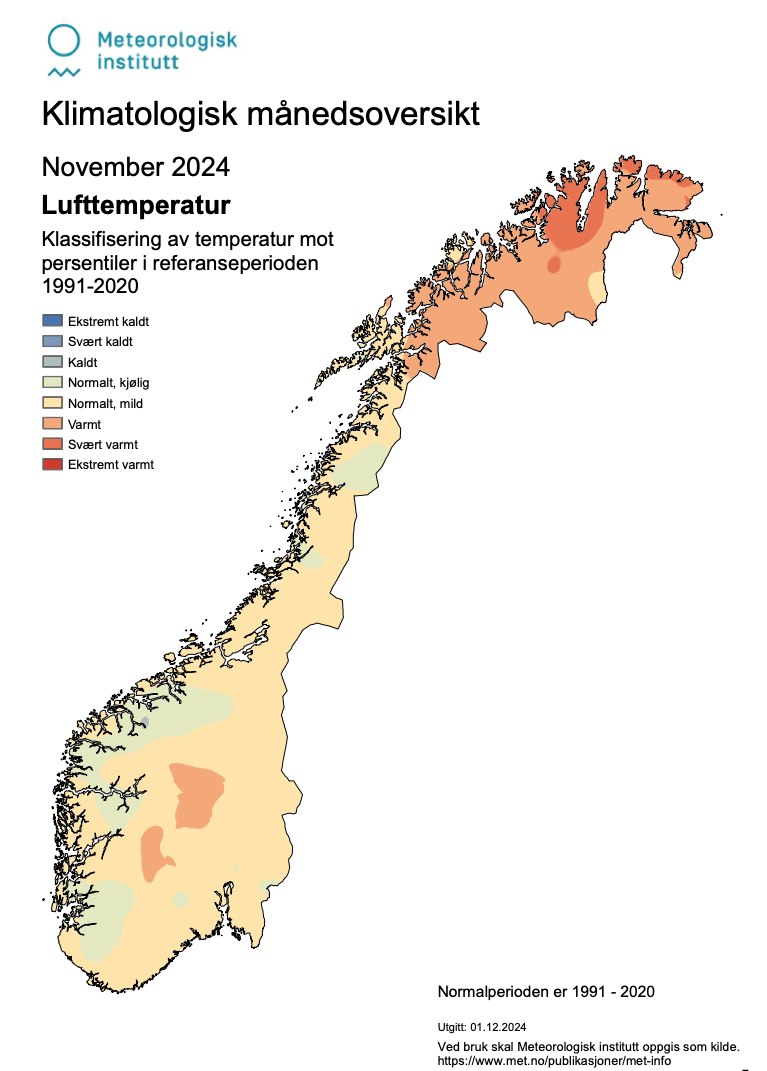 På landsbasis var temperaturen 1 grad over normalen, noe som gjør november 2024 til en av de 30 varmeste novembermånedene siden målingene startet i 1901.