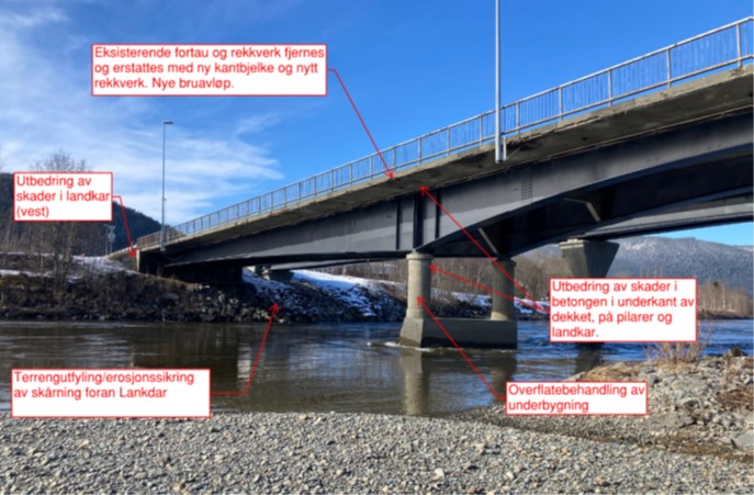 Kontraktsfrist for det planlagte vedlikeholdet var 1. oktober 2024, men under arbeidene ble det oppdaget at det ikke var kontakt mellom pilarene og brubjelkene i akse 5 pga. setninger i grunnen (se vedlagt illustrasjon og beskrivelse). Nå er også dette utbedret sammen med de planlagte vedlikeholdsarbeidene.