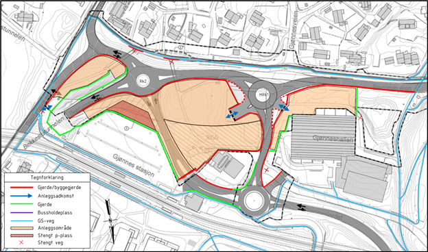 Fra og med fredag 13. desember legges trafikken om på Gjønnes. Veien fra rundkjøringen rett ved Bekkestutunnellen stenges for kjøring ned Gjønnesjordet, og erstattes med vei fra ny midlertidig rundkjøring nærmere Gjønneshallen (MRK1 på illustrasjon).