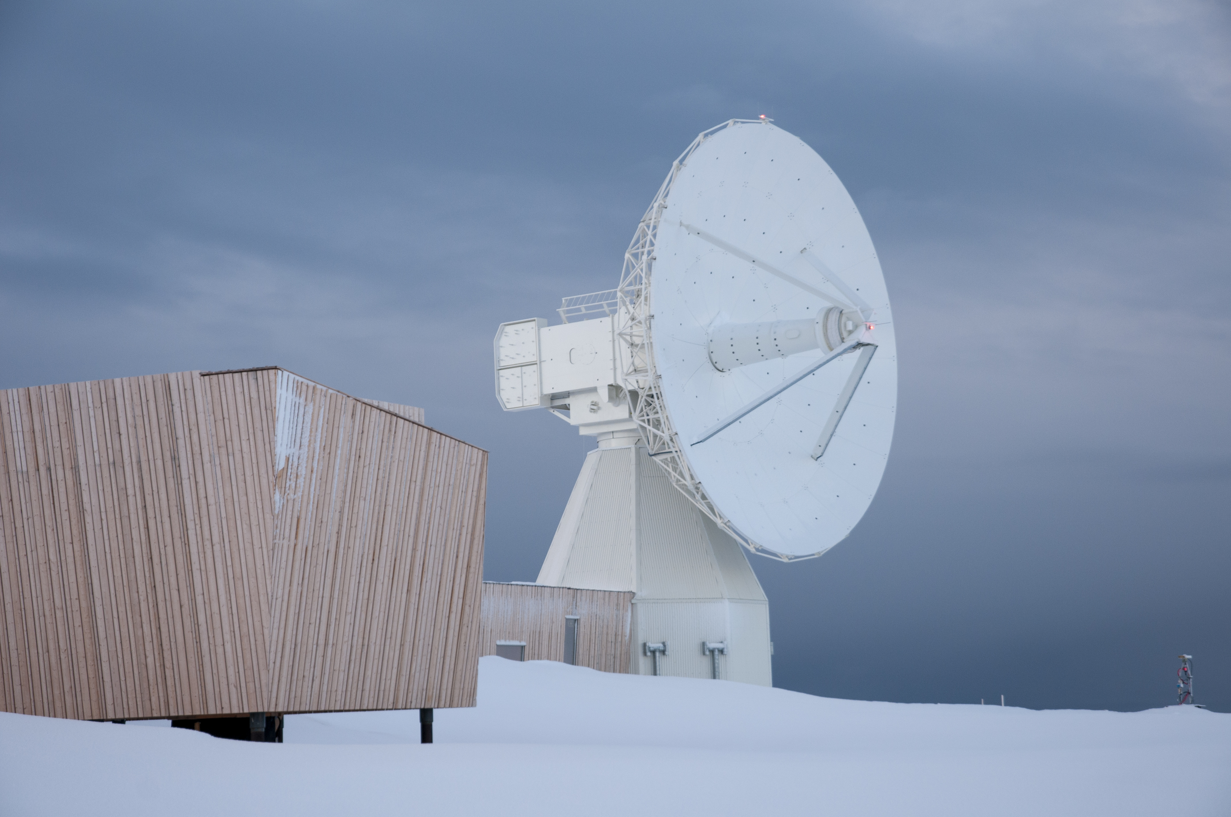 Jordobservatoriet i Ny-Ålesund er det nordligste observatoriet i sitt slag. Det inngår i et verdensomspennende forskningsnettverk innen geodesi. Fra observatoriet måler Kartverket jordas bevegelser og posisjon med flere geodetiske måleteknikker til samme tid og på samme sted. Foto: Per Anders Bjørklund / Kartverket. Bildet kan brukes i omtale av jordobservatoriet og må krediteres.