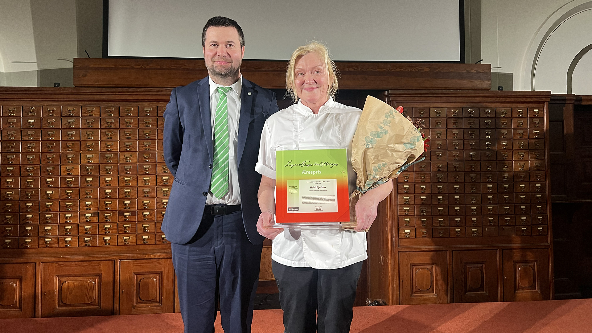 Avdelingsleder ved Strinda videregående skole i Trondheim, Geir‑Rune Larsen, vinner Ingrid Espelid Hovigs matkulturpris for sitt enestående arbeid innen rekruttering til restaurant- og matfag. Landbruks- og matminister Nils Kristen Sandtrøen delte ut prisen på Nasjonalbilioteket i Oslo.