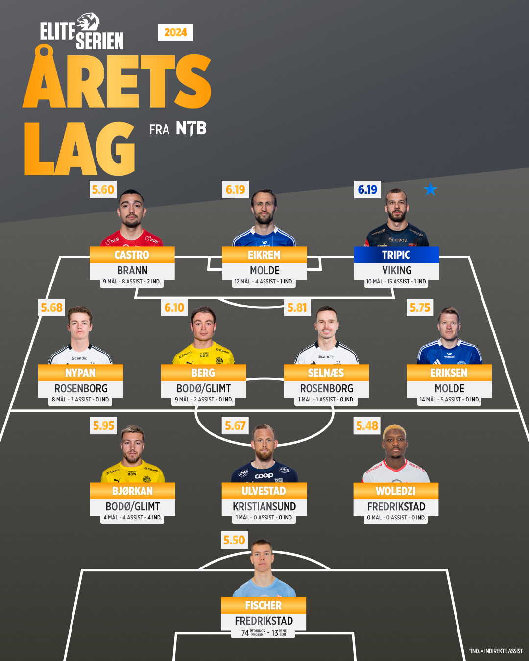 Tripic er en del av NTBs “årets lag” for Eliteserien 2024. Årets lag består av de spillerne som har prestert best på NTB-børsen gjennom sesongen eller utmerket seg svært positivt statistisk sett.