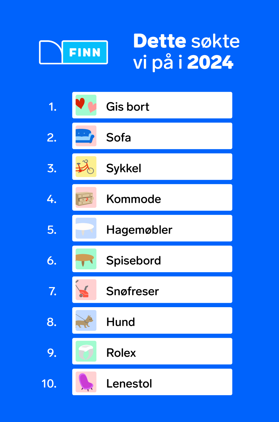 For andre år på rad topper "gis bort" listen over mest brukte søkeord på FINN torget, med over 2,5 millioner søk i løpet av 2024.